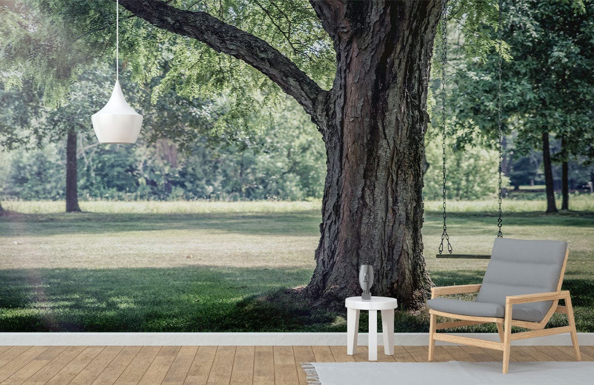Experience the serene charm of the Forest Swing Wallpaper Mural, where a majestic tree stands gracefully against a sun-dappled woodland backdrop. This mural captures the gentle whispers of nature with a swing invitingly poised under lush foliage. Its intricate textures and soft light imbue any space with sophistication and tranquillity, making it a timeless addition to both modern and classic interiors.