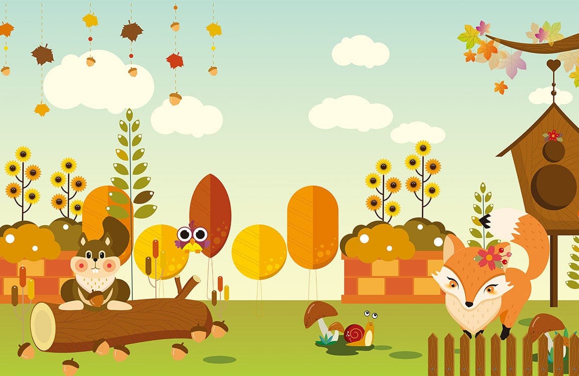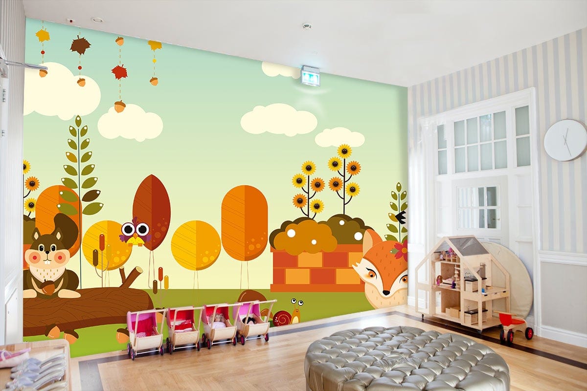 Introduce a whimsical charm to your space with the Fox & Squirrel Wallpaper Mural, where playful foxes and curious squirrels are nestled among vibrant autumnal trees. The artfully crafted illustration captures a sense of serene woodland beauty, making it a delightful addition to any room. Each detail, from the delicate falling leaves to the gentle gradient sky, lends an artistic touch that promises timeless sophistication and warmth.