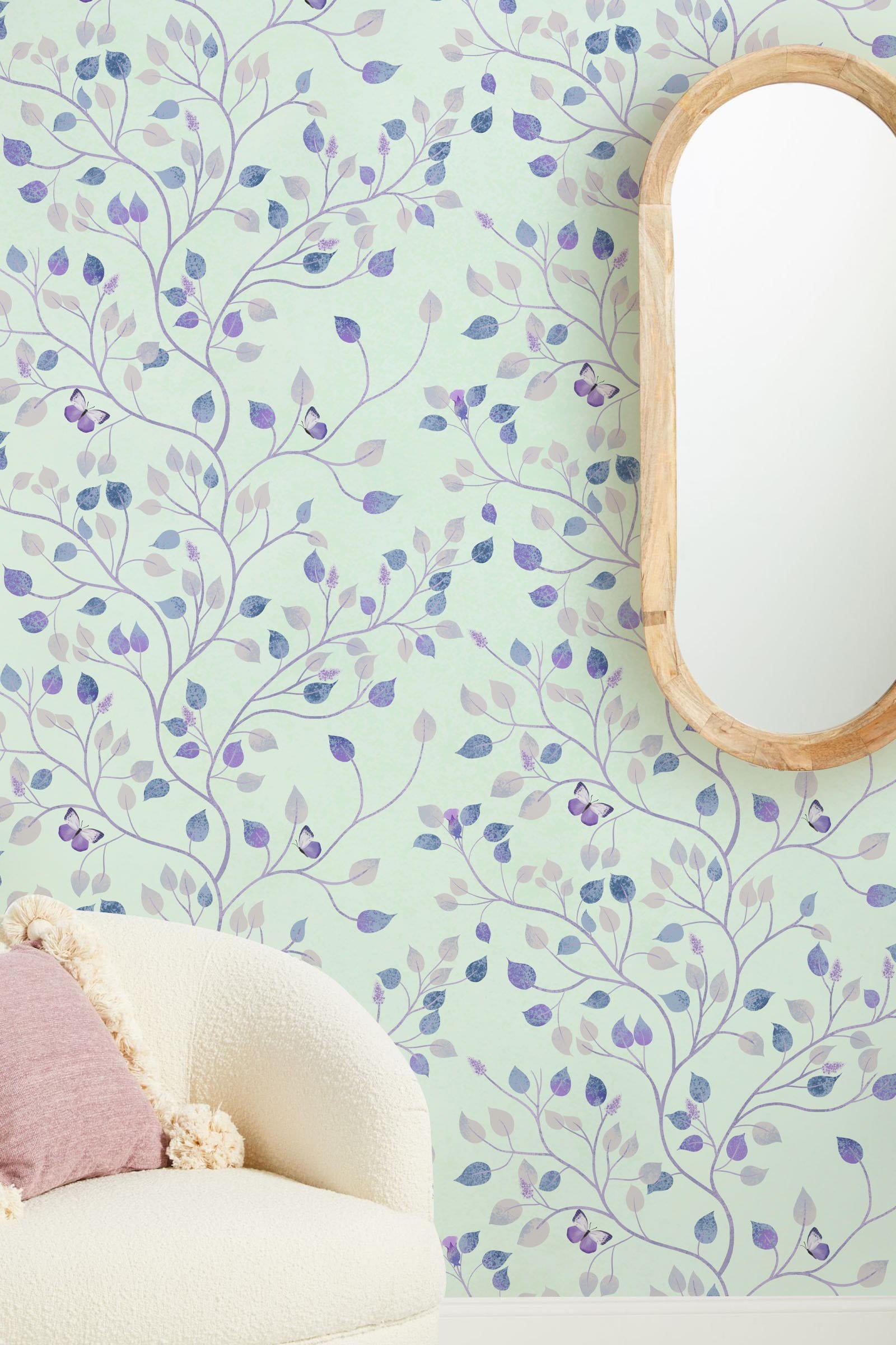 Give your room a timeless look with this beautiful leaves wallpaper. Featuring pastel blue leaves under soft green background, this wallpaper will give you a super stylish feature wall. Ideal for your living room or bedroom, this wallpaper could be placed behind a sofa, headboard, in alcoves or on a chimney breast for the biggest impact.