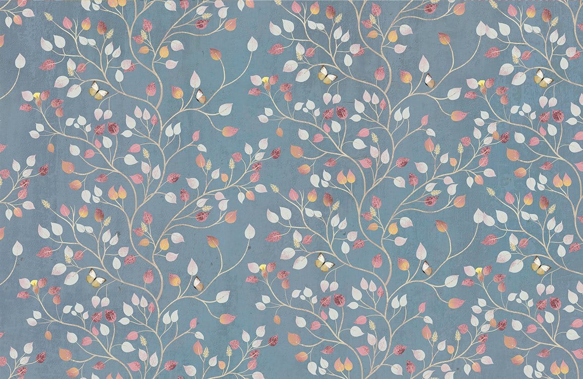 Discover a sophisticated interplay of style with the Fragrance Leaves Wallpaper Mural. Delicate branches adorned with intricate leaves sweep across a backdrop of serene blue-grey, creating a tapestry of elegance. Ideal for injecting a touch of nature's artistry into any room, this mural combines classic charm with contemporary flair, gracefully complementing various interior spaces.