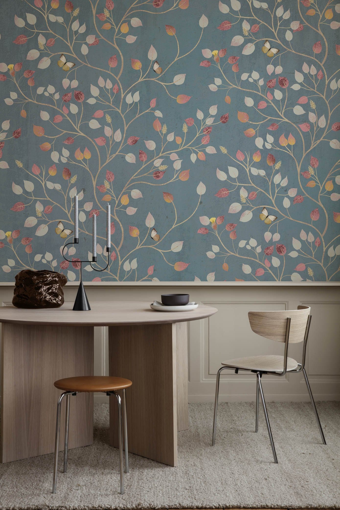 Give your room a timeless look with this beautiful leaves wallpaper. Featuring pastel leaves under soft blue background, this wallpaper will give you a super stylish feature wall. Ideal for your lounge or bedroom, this wallpaper could be placed behind a sofa, headboard, in alcoves or on a chimney breast for the biggest impact.