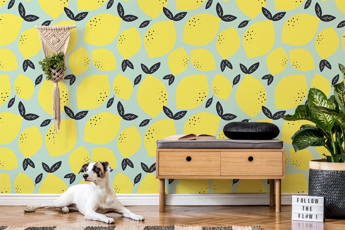 Add the taste of refreshment to your place by our colourful wallpaper with the baby blue background mixed with freshly repeated pattern of yellow lemons. This lemon mural wallpaper will make you feel the nice sour zest and refreshment around you. A simple repeated pattern that makes a good bedroom look. A perfect choice for your shop and a lovely decorating wallpaper in your kids鈥?room. The light blue makes the scale of the wallpaper widen the narrow places and gives a spacious feeling for it. Don鈥檛 miss this refreshing look wallpaper of the lemons will enlighten your space because of its lite vibe. Complete the look with modern furniture and let the wallpaper do its magic with the final view.