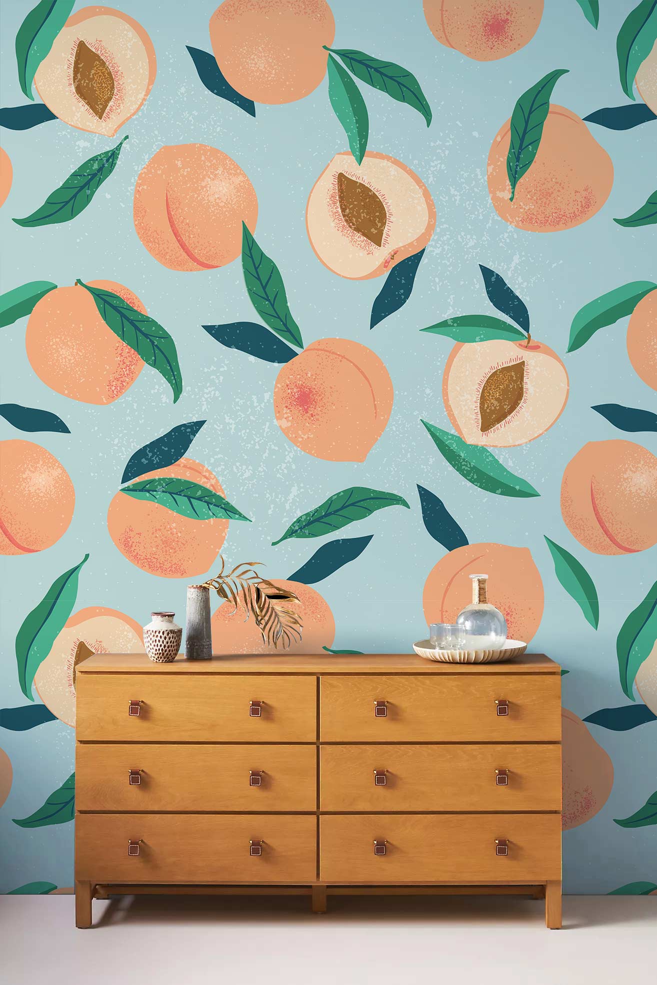 Give your place with a new taste of colours and modernity that will be just in your hands with one of our catchy designs for sliced peaches and full fruit mural wallpaper. The design looks so fresh and new, the colours palette is so different it captures the eye. The mix of the peachy colour with the aqua blue and the different shades of blue is just eye relaxing. For a wild and attractive look use this mural design in your living room for a warm strong design. Those who love unordinary colours are always unique and powerful. Try then to use plain neutral colours while having this design to give the full focus on the beauty of the design and the organization of the place.