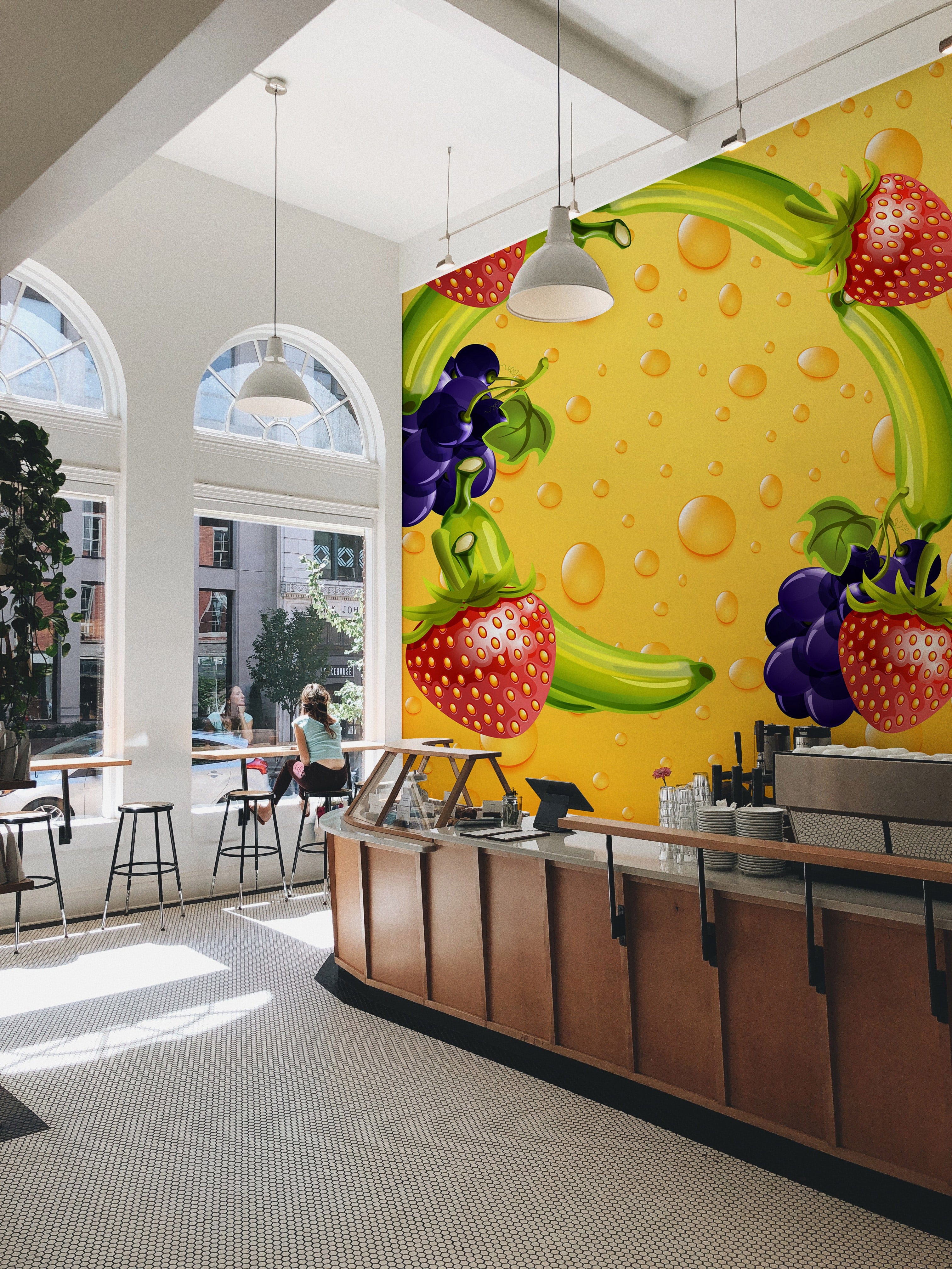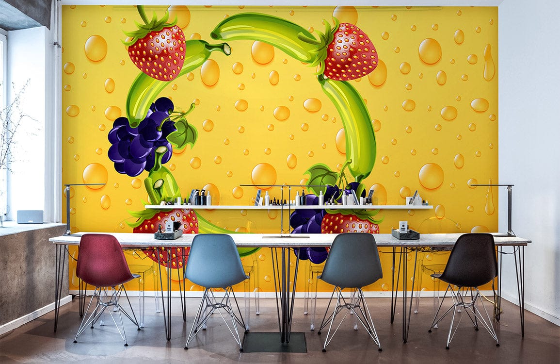 Delight in a whimsical design with the Fruit Circle Wallpaper Mural, where luscious strawberries, bananas, and grapes form an artistic circle against a vibrant yellow backdrop. The textured droplets add depth, evoking a refreshing and lively atmosphere ideal for modern and eclectic interiors.