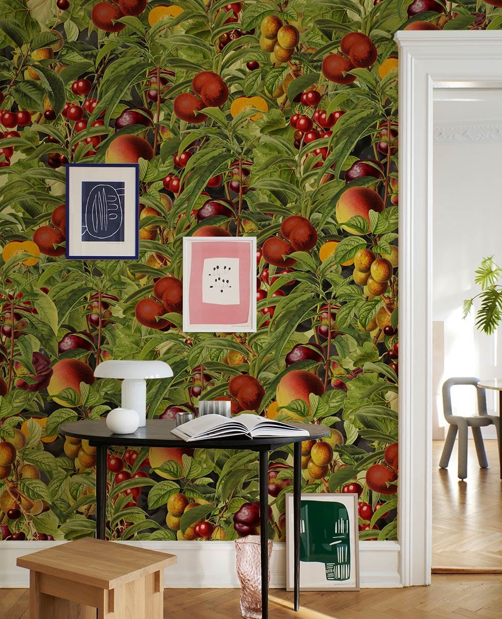 Immerse your space in the lush vibrancy of the Fruit Harvest Wallpaper Mural. This captivating design weaves intricate clusters of ripe peaches, cherries, and golden berries amidst verdant leaves, crafting a visual tapestry that exudes a timeless charm and warmth. Perfectly suited for any interior, its artisanal detail and rich textures create an inviting ambience, making it an exquisite choice for refined aesthetics.