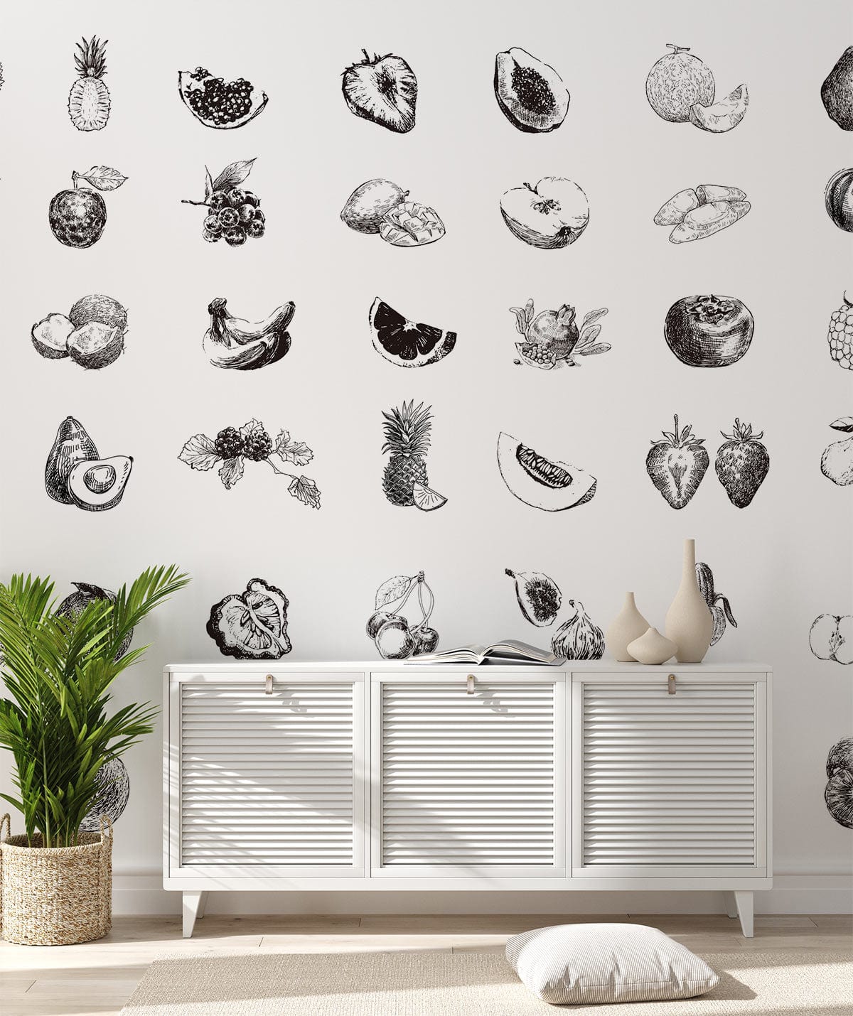 Adorn your walls with the exquisite Fruit Pieces Wallpaper Mural, where intricately detailed fruit illustrations create a timeless tapestry. Each piece is hand-sketched with precision, offering a monochromatic elegance that suits any sophisticated space. The textured design invites a harmonious blend of art and nature, making it a versatile choice for enriching any interior.