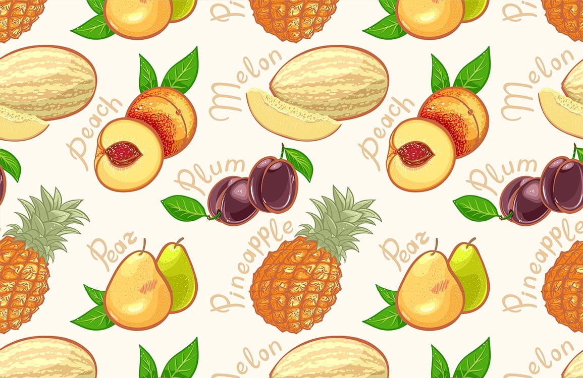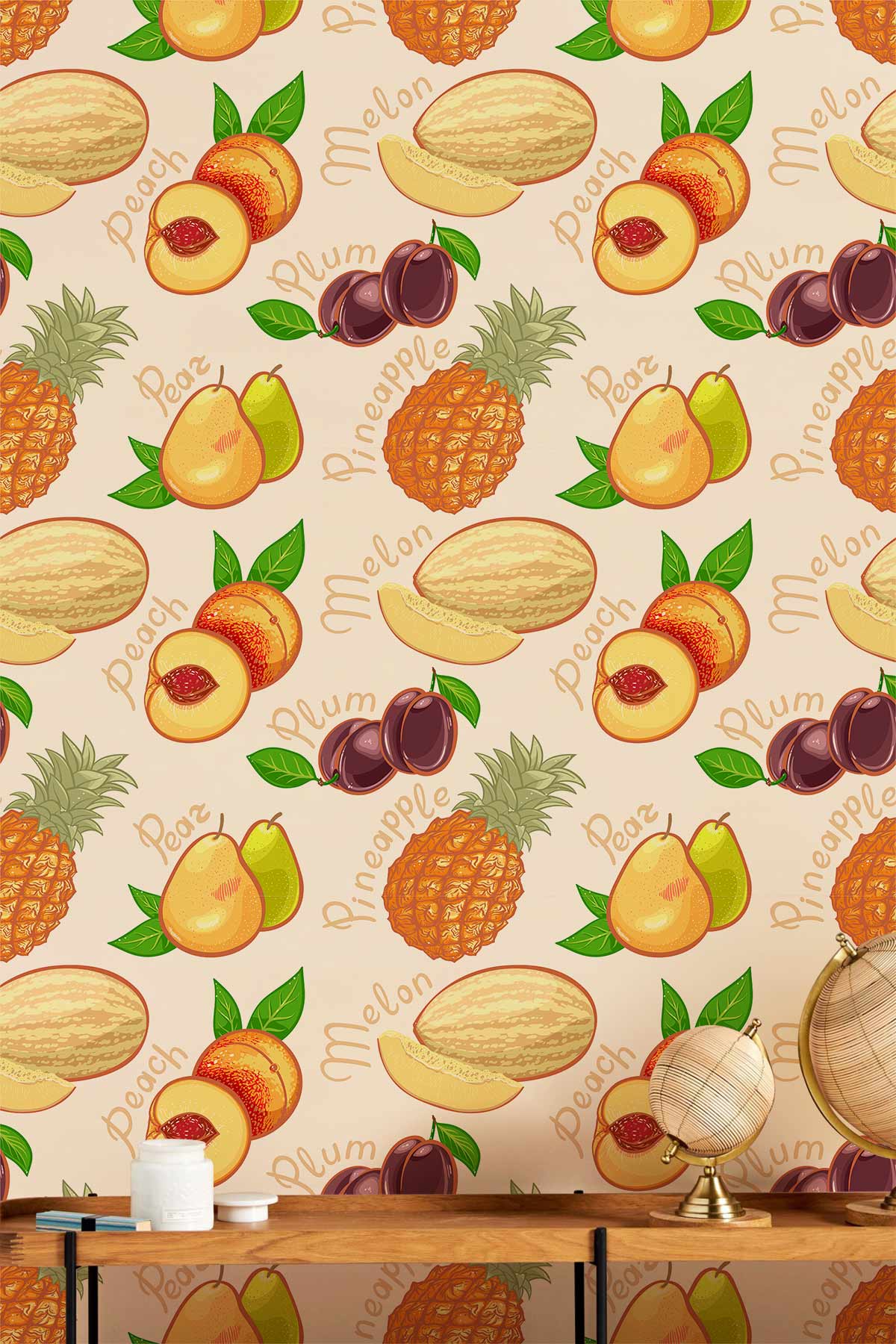 This Fruit Wallpaper Mural features a delightful interplay of ripe peaches, plump plums, and juicy pineapples, capturing the essence of timeless elegance. The vivid colours bring a fresh and inviting atmosphere, perfectly balanced against a subtle cream backdrop. Its intricate design and refined texture create a sophisticated ambience, making it an exquisite choice for any interior setting.
