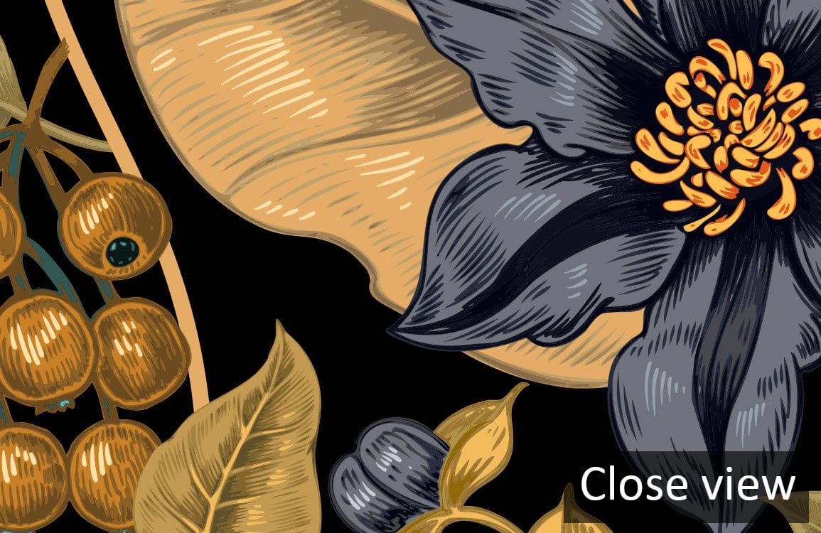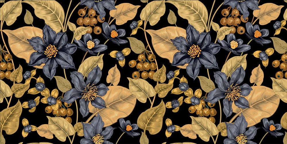 Immerse your space in the lush allure of the Fruitage Flower Wallpaper Mural, where deep blue petals elegantly entwine with warm gold foliage against a rich black backdrop. This exquisite design fuses botanical motifs with artistic precision, creating a tapestry of visual intrigue and timeless sophistication. Perfect for adding a touch of nature's serenity to both traditional and contemporary interiors, it effortlessly complements any setting.
