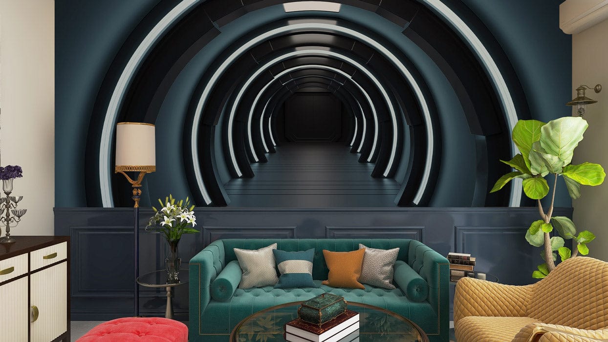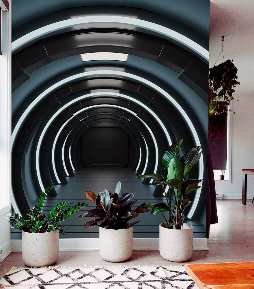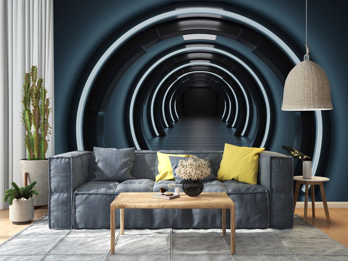 Invite an aura of modern mystique into your space with the Futuristic Tunnel Escape Mural Wallpaper. Its sleek design, featuring interlocking luminous arcs, offers a striking depth that captivates the eye. Ideal for spaces seeking a statement piece, this mural creates a visionary escape, with its subtle metallic textures and harmonious layout. Perfectly crafted to complement both contemporary and eclectic interiors, it becomes a compelling centrepiece in any room.