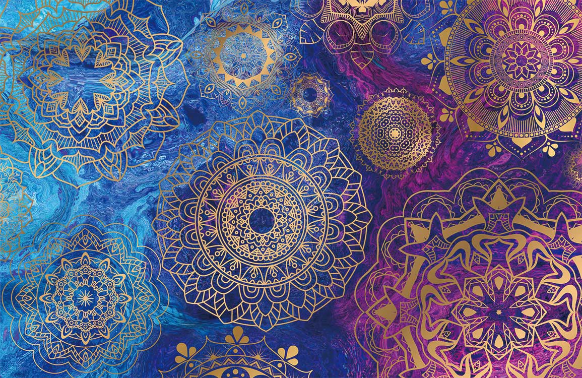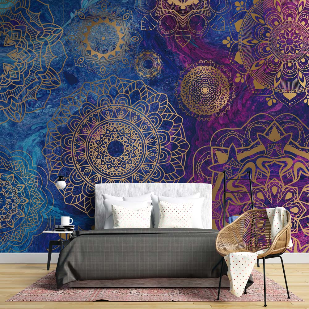 Immerse your space in the celestial allure of the Galaxy Mandala Patterns Wallpaper Mural, where intricate mandala designs intertwine with a cosmic tapestry of blues and purples. The delicate gold highlights offer a luxurious contrast, creating a harmonious balance that resonates with both modern and classic interiors. This mural invites a sense of tranquillity and sophistication, perfectly tailored for spaces that crave an artistic and serene ambience.