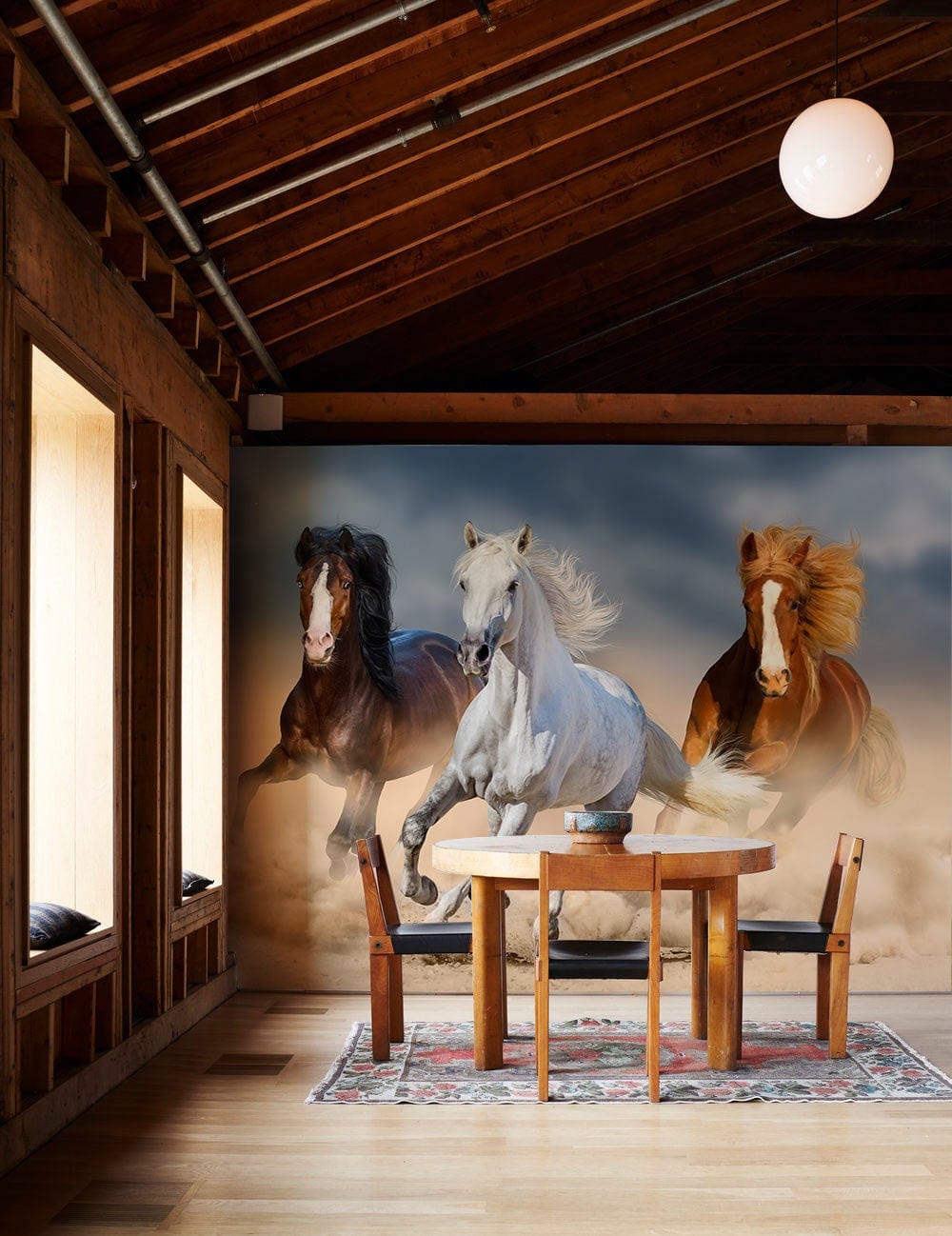 Our galloping horses鈥?mural wallpaper will fill your place with the power and prides vibes that will show how very chic and authentic your place is. impress everyone with your taste and the elegancy of your place with these three galloping horses full showing their strength and ambitions. This design is perfect for a place where you want to fill with energy and strong vibes. The strong dynamicity in the wallpaper will make your place always look so vibrant and unique.