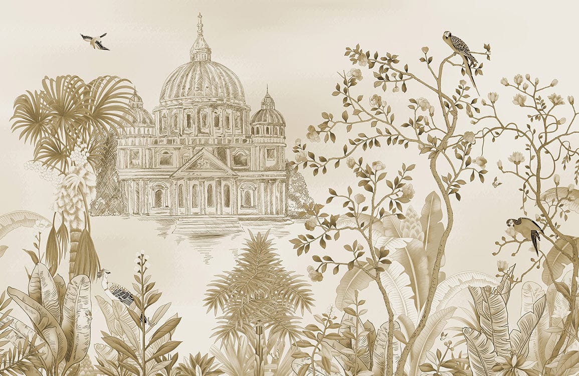 The Garden Capital II Wallpaper Mural invites you on a journey through time, expertly blending architectural grandeur with the serene beauty of nature. Its intricate design showcases a majestic structure surrounded by lush foliage and elegant birds, creating a scene that's both captivating and calm. Ideal for infusing any space with an aura of sophistication and historical allure, this mural effortlessly complements a wide array of interiors.