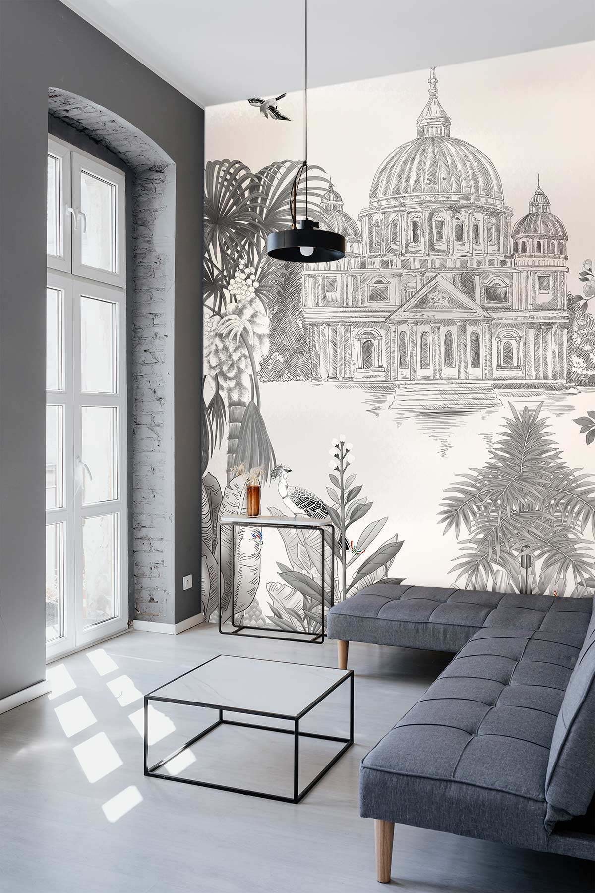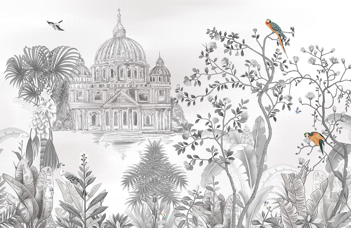 The Garden Capital Wallpaper Mural presents a captivating blend of nature and classic architecture, framing a distinguished dome surrounded by lush foliage and vibrant parrots. Its fine details and soft textures evoke an air of sophistication, making it an ideal choice for those seeking a refined yet inviting ambience. This mural effortlessly harmonises with traditional and contemporary interiors, serving as an exquisite backdrop for a variety of spaces.