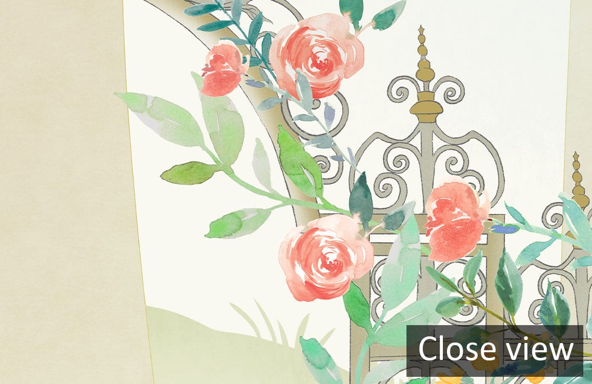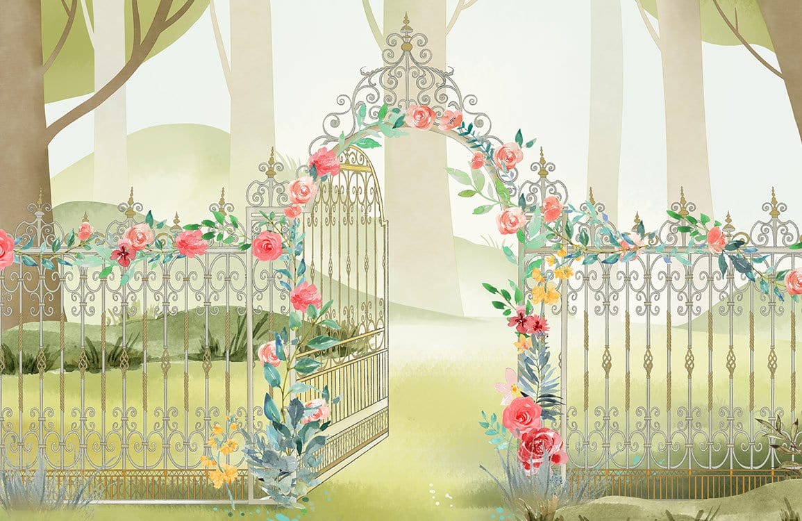 Immerse yourself in a serene woodland vista with the Flower Gate Wallpaper Mural, featuring a delicate wrought-iron gate adorned with blooming roses and lush greenery. Its painterly design invites a subtle blend of nature into your home, offering a sophisticated backdrop that complements both traditional and contemporary settings.
