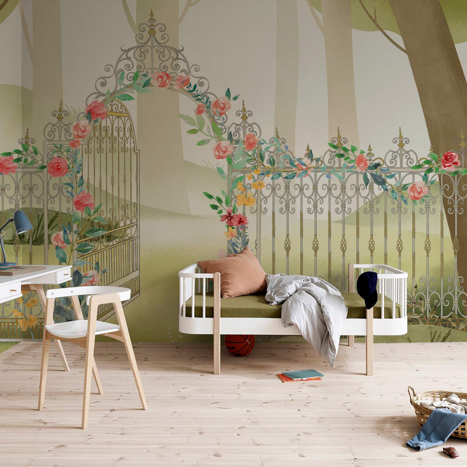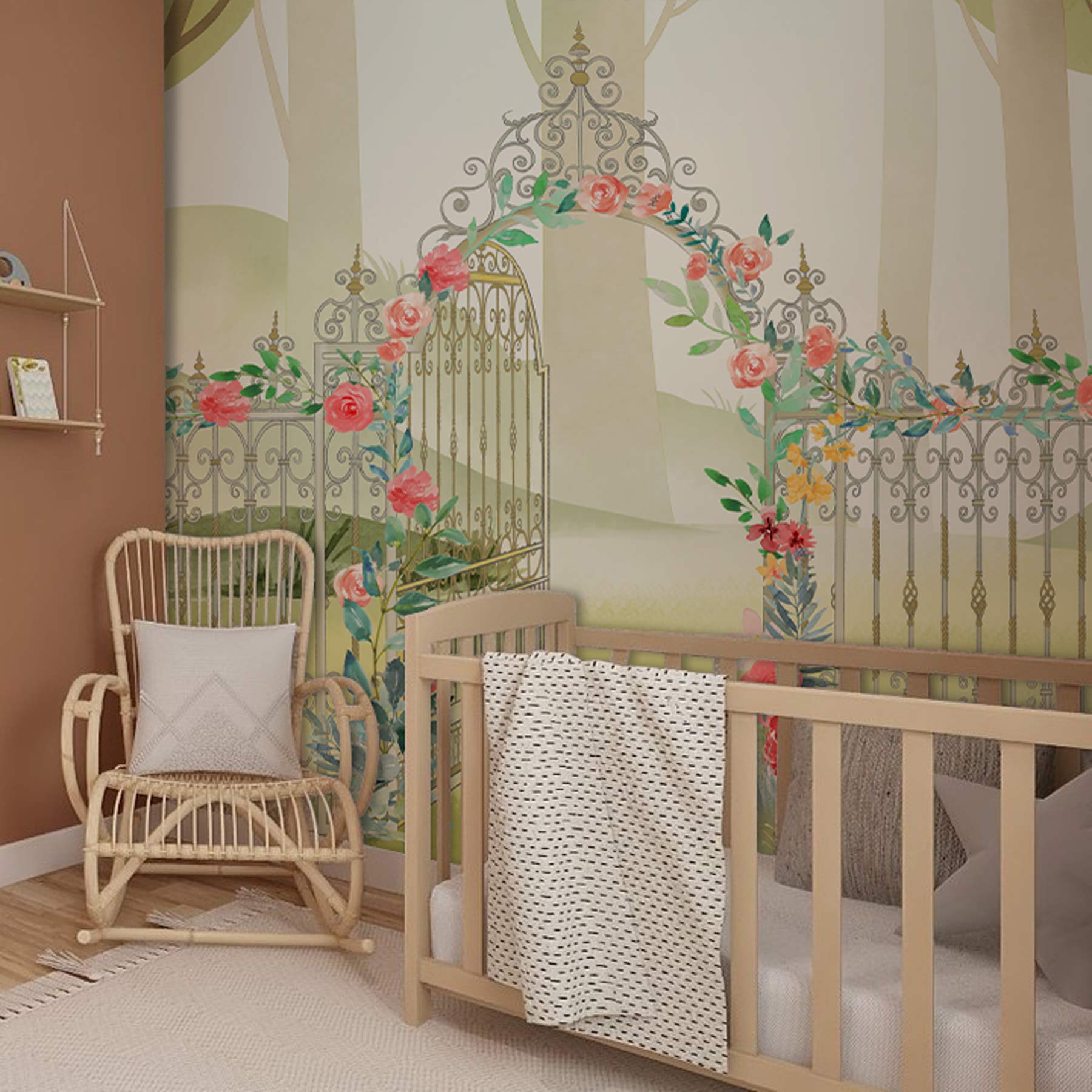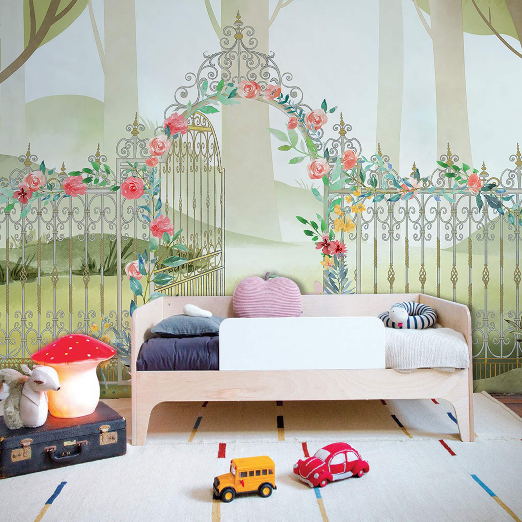 Open the gate and embrace the green fresh nature with this beautiful wallpaper mural. This wallpaper design will take any kids room or nursery from plain to exciting with its creative and playful design. Match the wallpaper adorable tones by styling your children's space with lots of warm and soft colours, and keep things simple with a minimal mix of neutral and white decor.