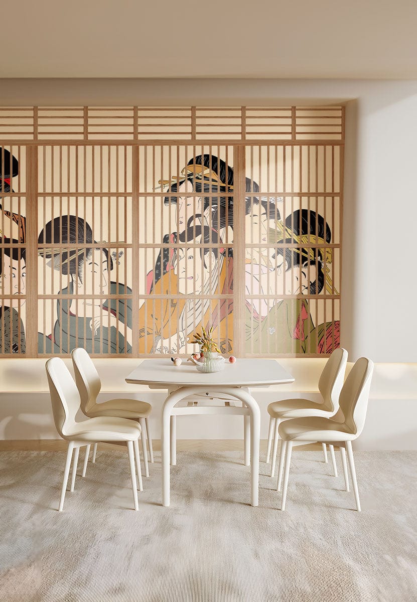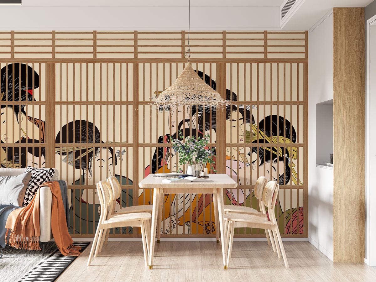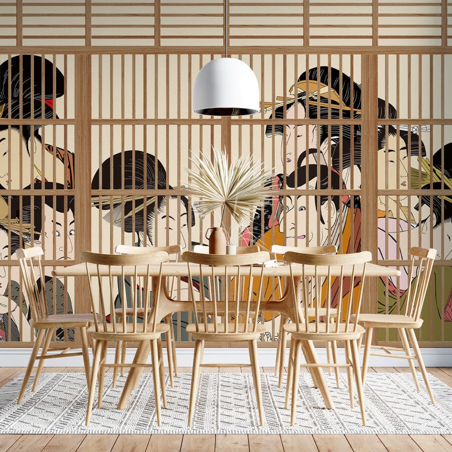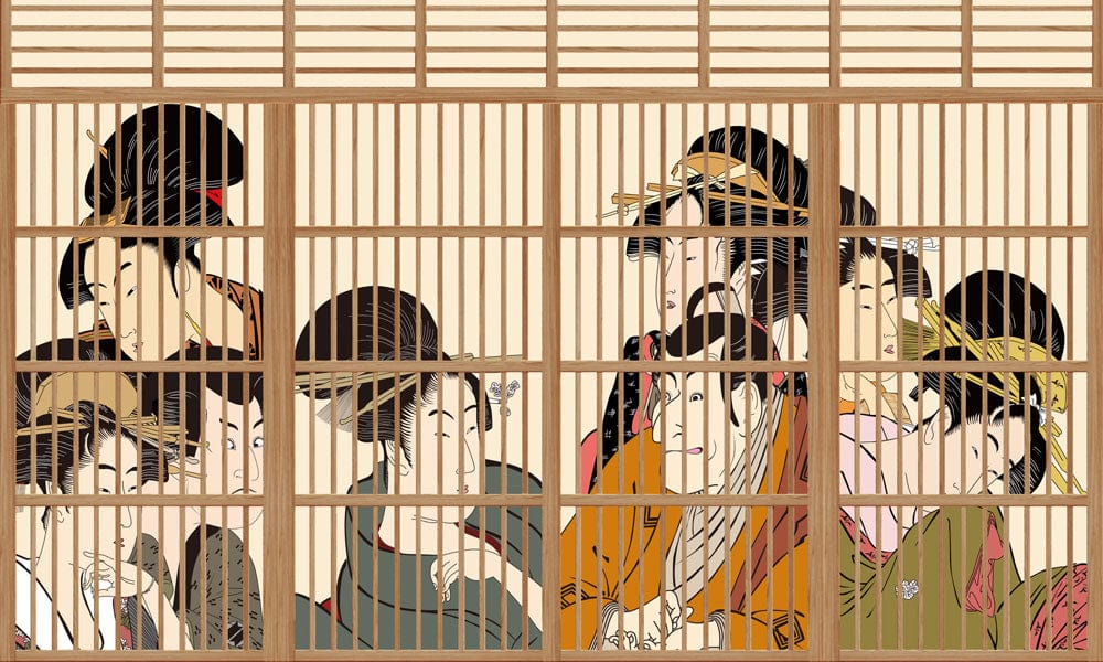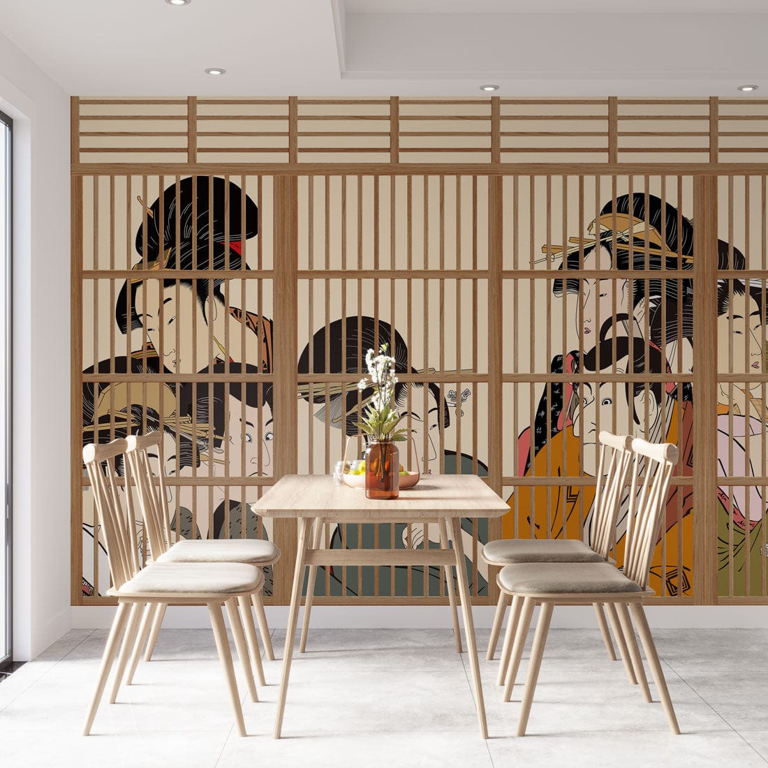 Immerse your space in elegance with the Geisha Behind Screens Mural Wallpaper, featuring intricately detailed figures artfully arranged behind traditional screens. The harmonious blend of earth tones with soft, muted hues evokes a sense of serenity and timeless charm. This artwork transcends mere decoration, offering an authentic glimpse into a classic narrative. Ideal for creating a sophisticated backdrop, it refines interiors with its elegant portrayal, fitting seamlessly into any setting seeking cultural depth and style.