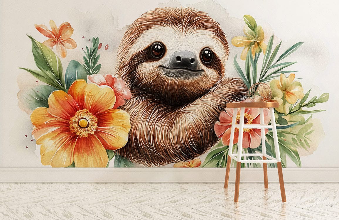 This charming mural captures an adorable sloth nestled among soft, hand-painted florals. Warm earthy tones and delicate botanical details create a calm, joyful atmosphere. The watercolor-style illustration brings a sense of comfort and playfulness, perfect for adding warmth and personality to a space.
