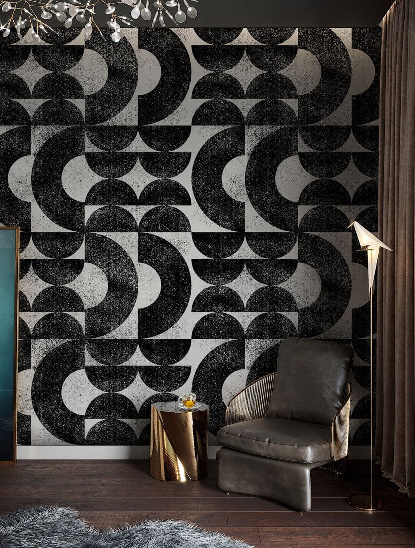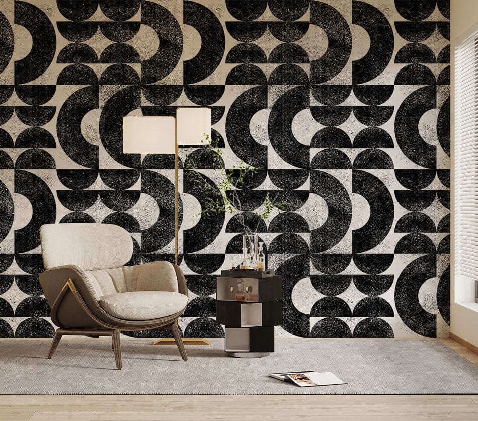 The Geometric Crescent Flow Mural Wallpaper captivates with its rhythmic arrangement of crescents and arcs, creating a mesmerising visual symphony. Its monochrome palette lends a timeless and sophisticated air, making it an impeccable choice for both classic and contemporary interiors. The textured surface adds depth, providing a tactile elegance that enhances its artistic allure.