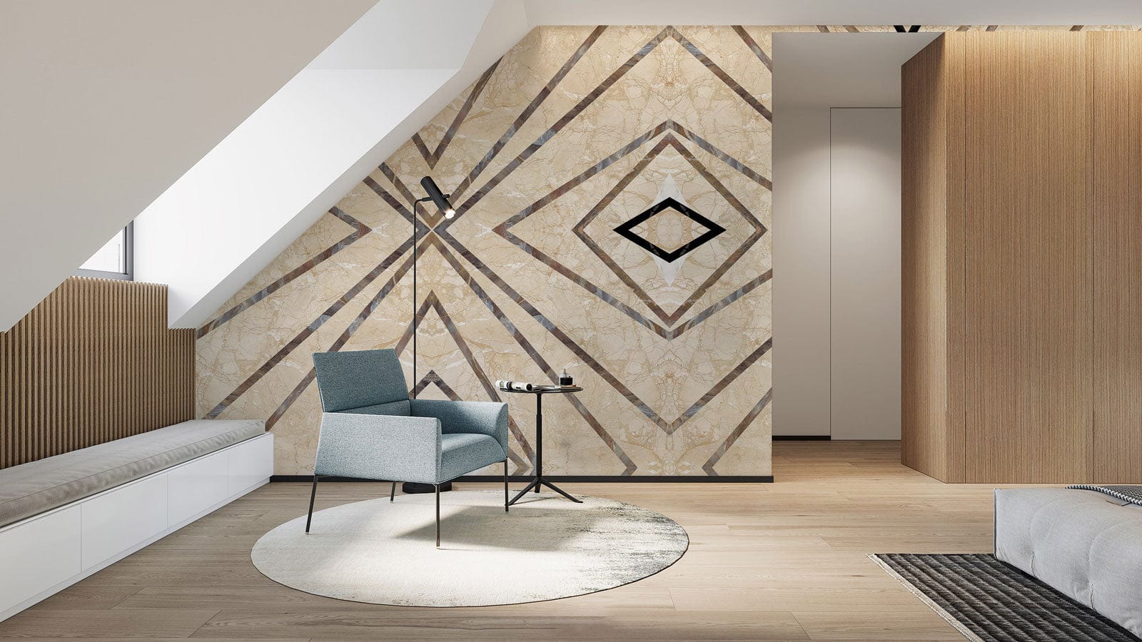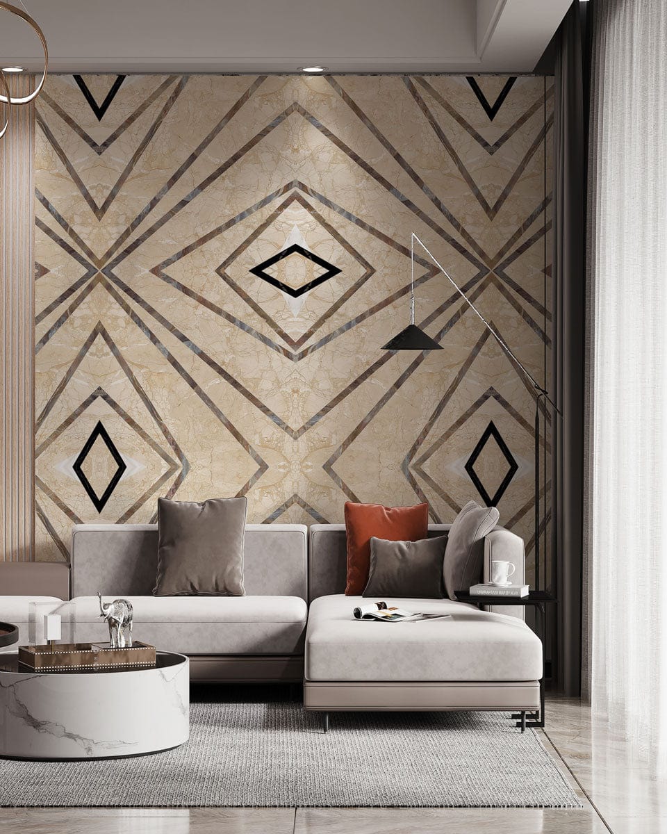 Introduce a sense of elegance with this Geometric Eye Marble Wallpaper Mural. Its intricate diamond patterns are gracefully set against a soft marble background, adding depth and sophistication to any room. The timeless beige and grey tones create a welcoming ambience, perfectly suited for modern or classic interiors.