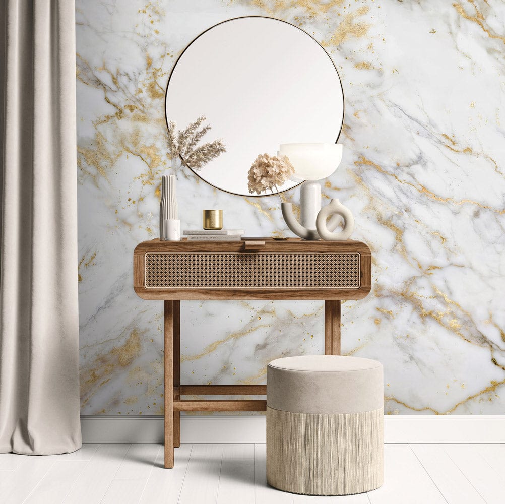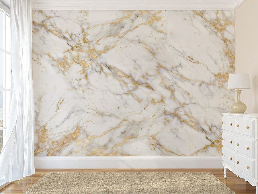 The Gilded Marble Elegance Mural Wallpaper seamlessly intertwines opulent marble textures with lustrous golden veins. This exquisite design captures the essence of classic artistry, offering a sophisticated statement piece that elevates any interior. The rich details and smooth patterns evoke a timeless allure, making it a fitting choice for spaces seeking both luxury and subtlety.