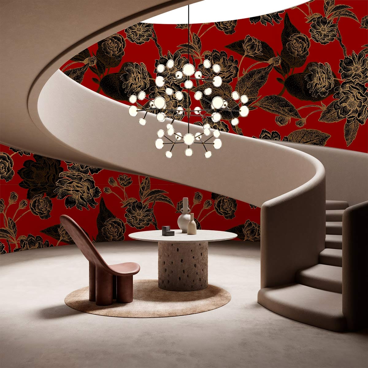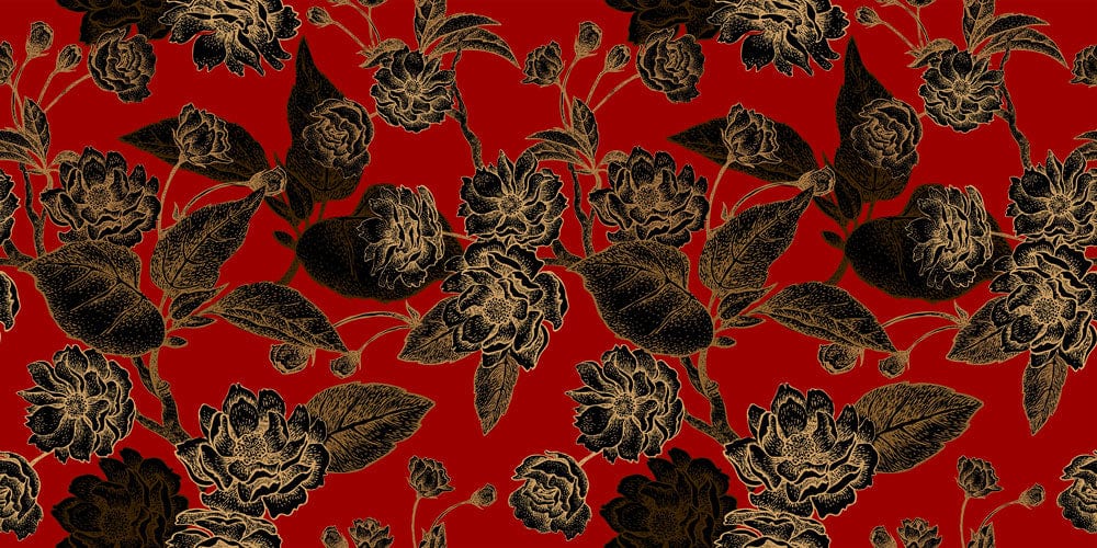 The Gilt Blossom Wallpaper Mural exudes elegance, with its intricate floral pattern set against a rich crimson backdrop. Delicately gilded blooms entwine amidst bold leaves, creating a refined tapestry of nature's splendour. This artful design marries timeless sophistication with a touch of vintage allure, making it an exquisite choice for any space seeking a hint of luxury.
