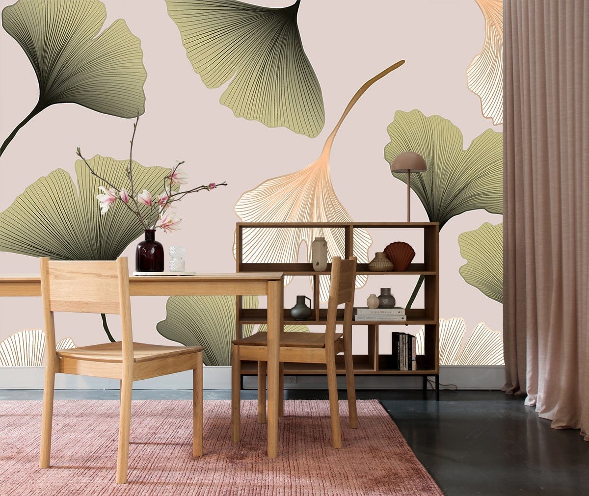 Immerse your space in the serene elegance of the Ginkgo Leaf Wallpaper Mural, featuring delicate, fan-shaped leaves in a harmonious interplay of soft greens and gentle neutrals. This refined design evokes a tranquil, natural beauty, making it a captivating choice for both traditional and contemporary interiors. The intricate detailing offers a subtle textural depth, bringing an organic sophistication to living spaces.