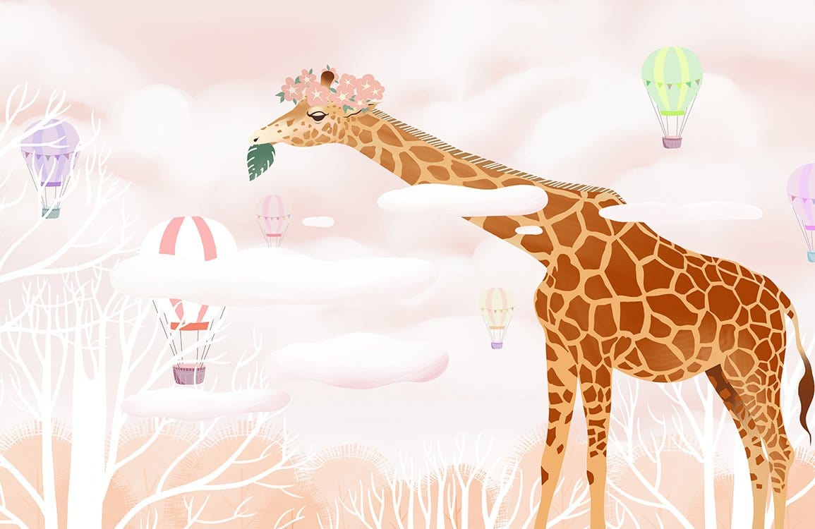Your kids are going to love this animal wallpaper mural. Featuring a cute giraffe wandering in the forest with hot balloons in the pastel pink sky. This adorable, attractive painting is heart-melting and will be perfect for your child's bedroom and playroom. Interesting rendering with a natural atmosphere and a refreshing wall decoration perfect for your kids.