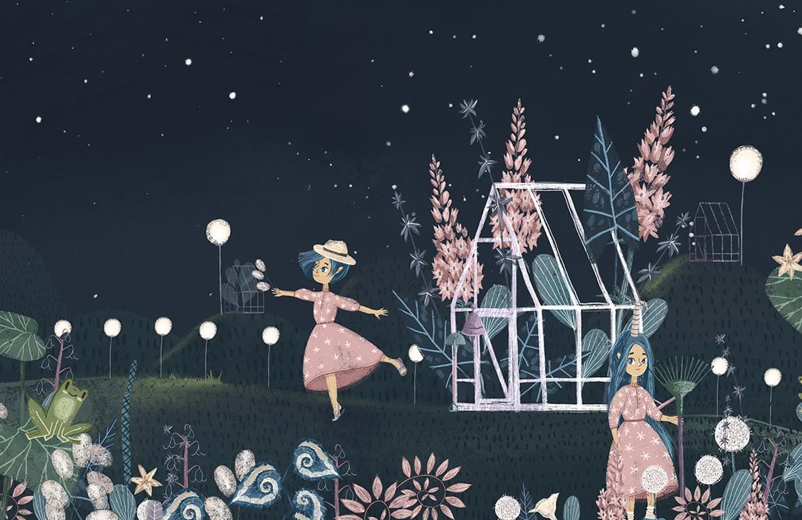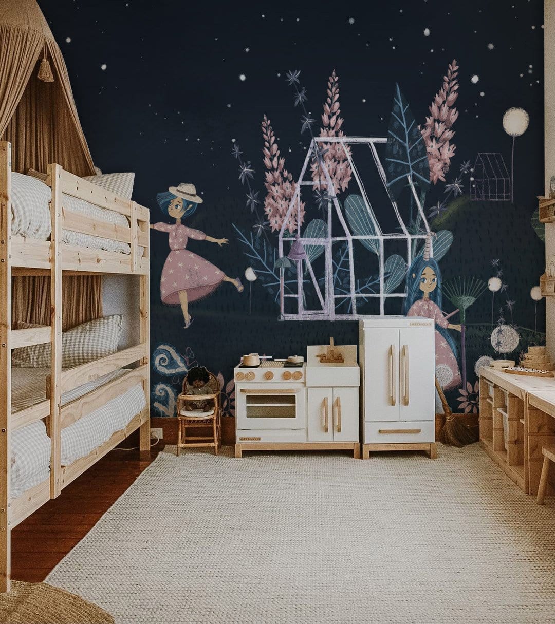 Bring a spectacular vibe to your space with this beautiful girl in the field wallpaper mural. The artwork featuring? girls dancing and playing in the field at night will bring your room to life. Use it as a feature wall in your little girl's room with furniture of your choice as the white backdrops is perfect to pair with all home decoration.