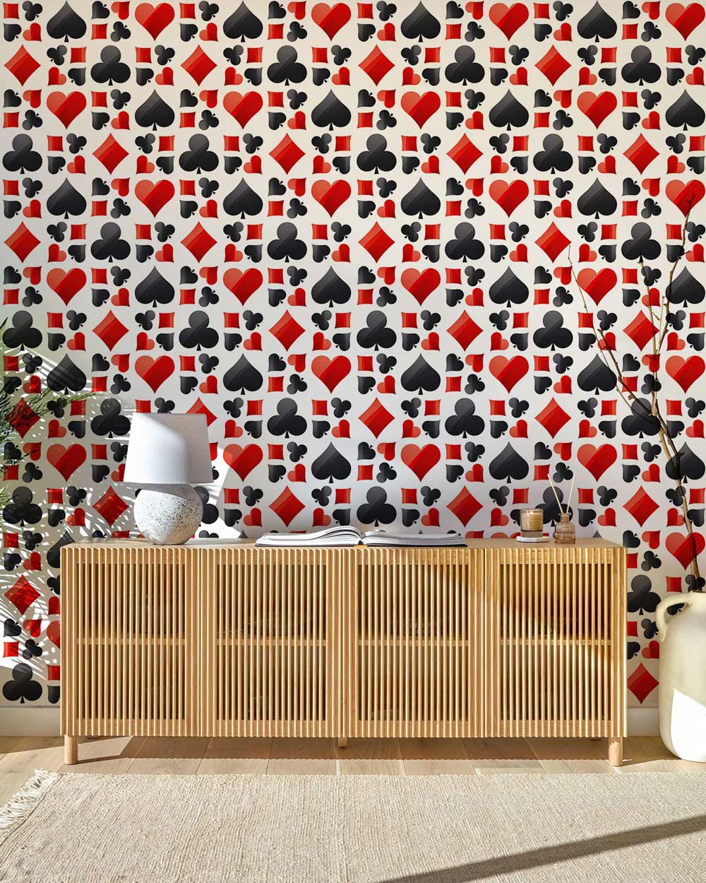 Step into a world of sophistication with the Glossy Poker Wallpaper Mural. Featuring an elegant tapestry of playing card motifs, the rich interplay of red and black symbols against a crisp white background evokes a sense of timeless allure. Perfect for creating a bold statement, this mural seamlessly fits into diverse interior styles, providing an inviting and artistic ambience.
