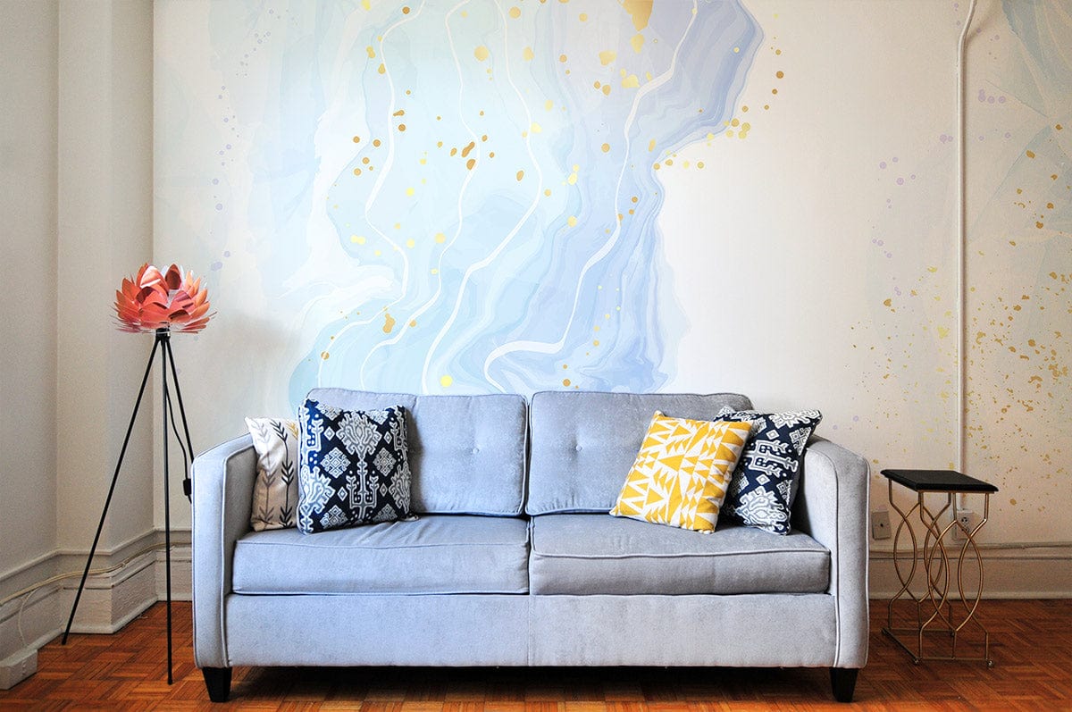 This Gold Dots Wallpaper Mural beautifully weaves soft waves of blue with delicate gold accents, capturing an ethereal essence. The intricate design features subtle marbled textures and shimmering specks, evoking a sense of understated elegance. It effortlessly harmonises with both modern and classic interiors, offering a sophisticated backdrop for living rooms, bedrooms, or offices.