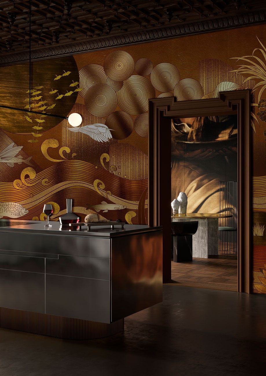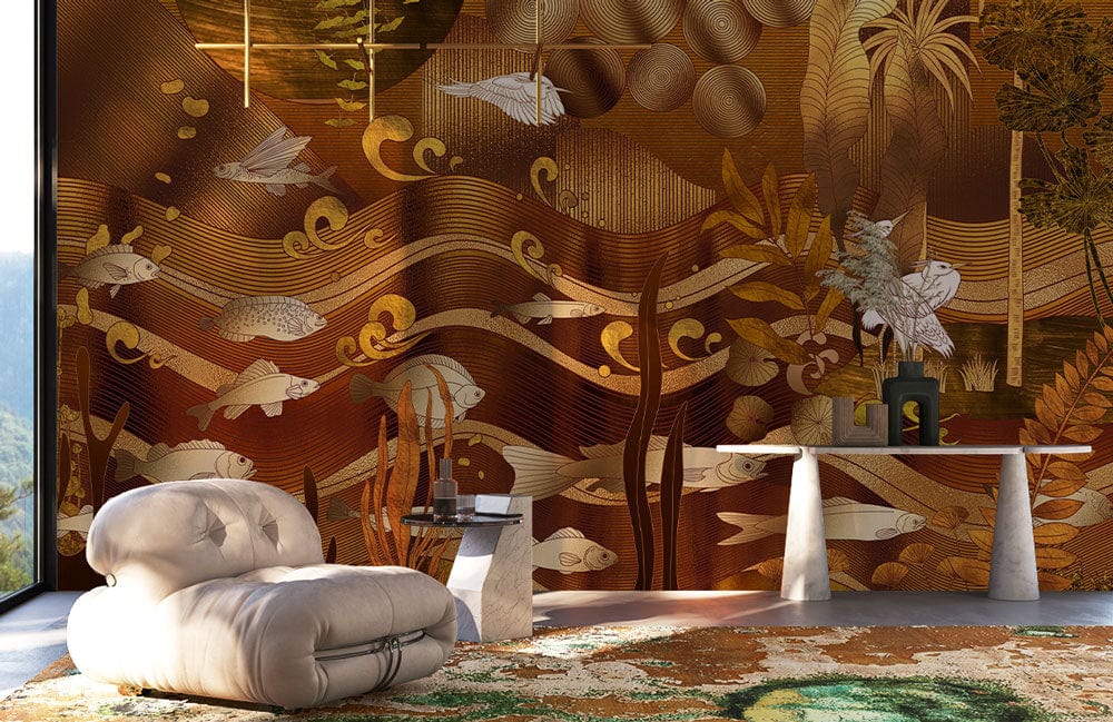 Dive into sophistication with the Golden Abstract Ocean Wallpaper Mural. This exquisite design features a harmonious blend of swirling marine motifs and elegant fauna, set against a backdrop of rich golden hues. The intricate patterns and subtle textures evoke the gentle flow of ocean currents, adding depth and a sense of tranquillity to any space. Its artistic allure is perfect for both modern and eclectic interiors, providing a timeless piece that captivates and inspires.
