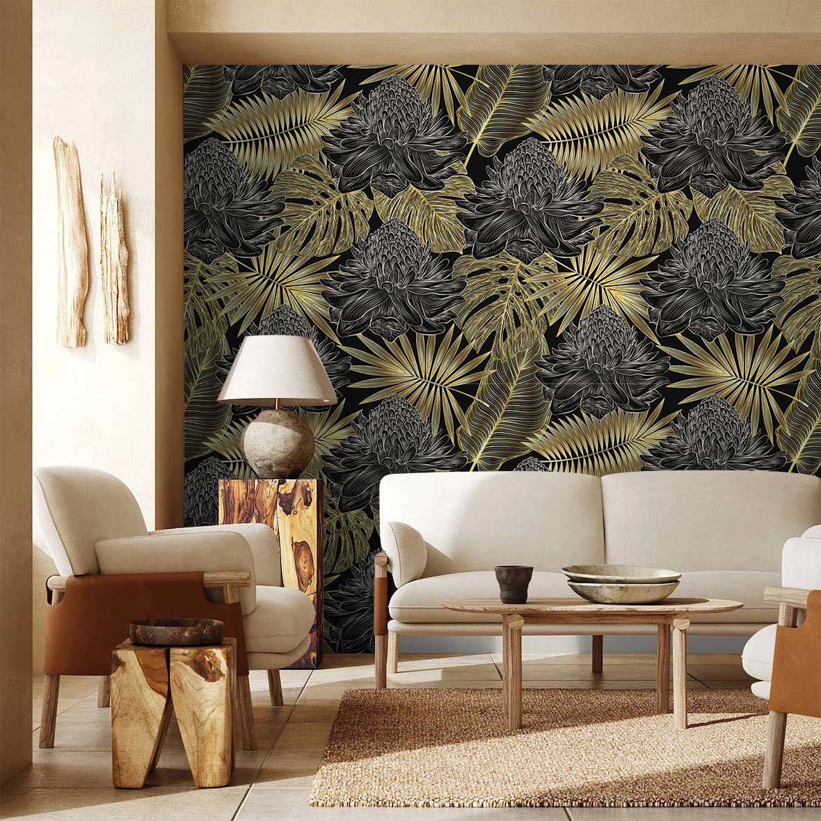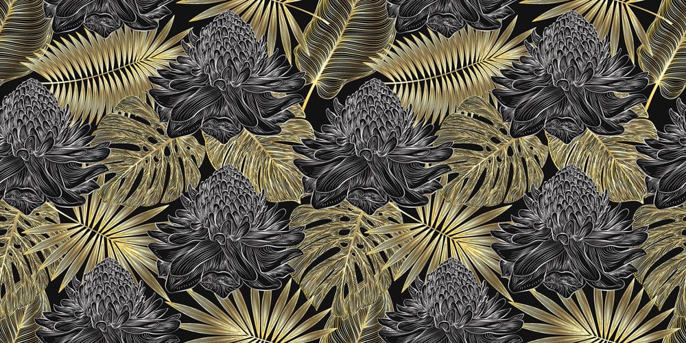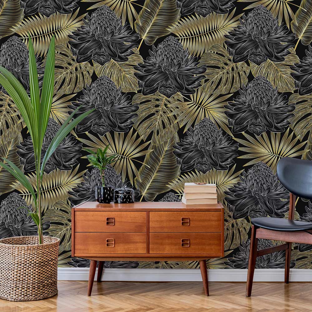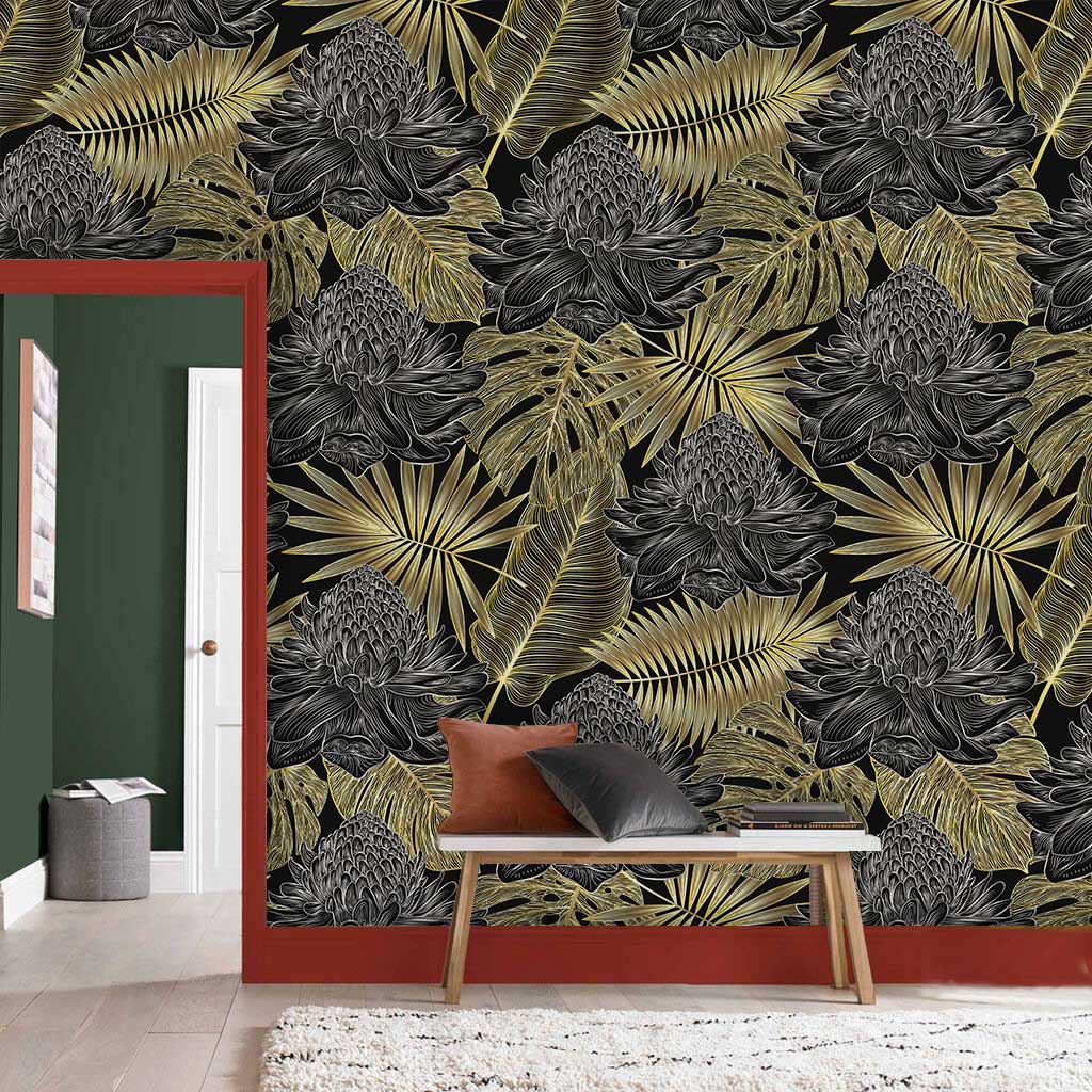 Immerse your space in luxury with this Golden and Dark Wallpaper Mural, where intricate botanical patterns unfold across a deep, rich backdrop. The exquisite interplay of gilded leaves against darker floral motifs offers a balanced elegance, making this mural a striking centrepiece for refined interiors. Its textured surface adds depth, inviting touch and admiration, whilst exuding a timeless charm that integrates seamlessly into varied settings.