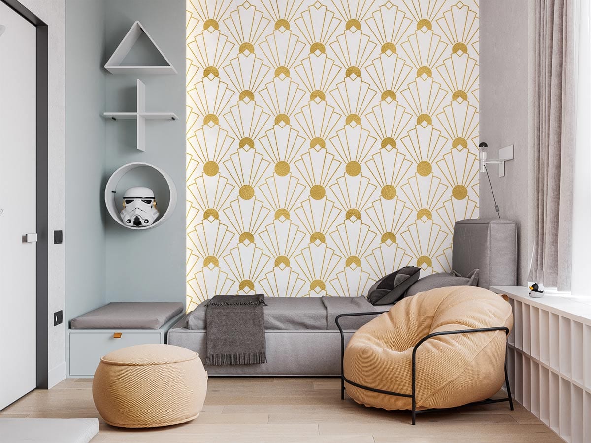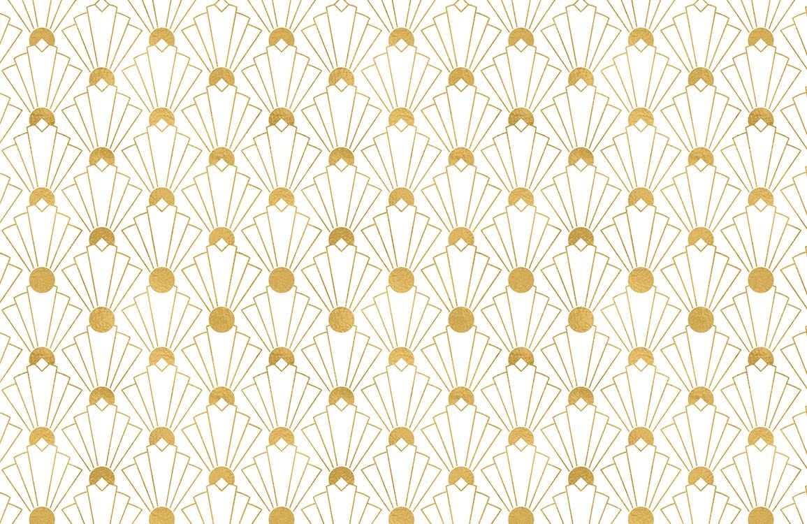 Golden Art II Wallpaper Mural offers a timeless tapestry of elegance, with intricate fan motifs rendered in shimmering gold against a pristine white backdrop. Its Art Deco-inspired design exudes a sense of luxury and refinement, making it a perfect complement for modern, minimalist, or vintage interiors. Create a captivating focal point that infuses a space with understated glamour and charm.