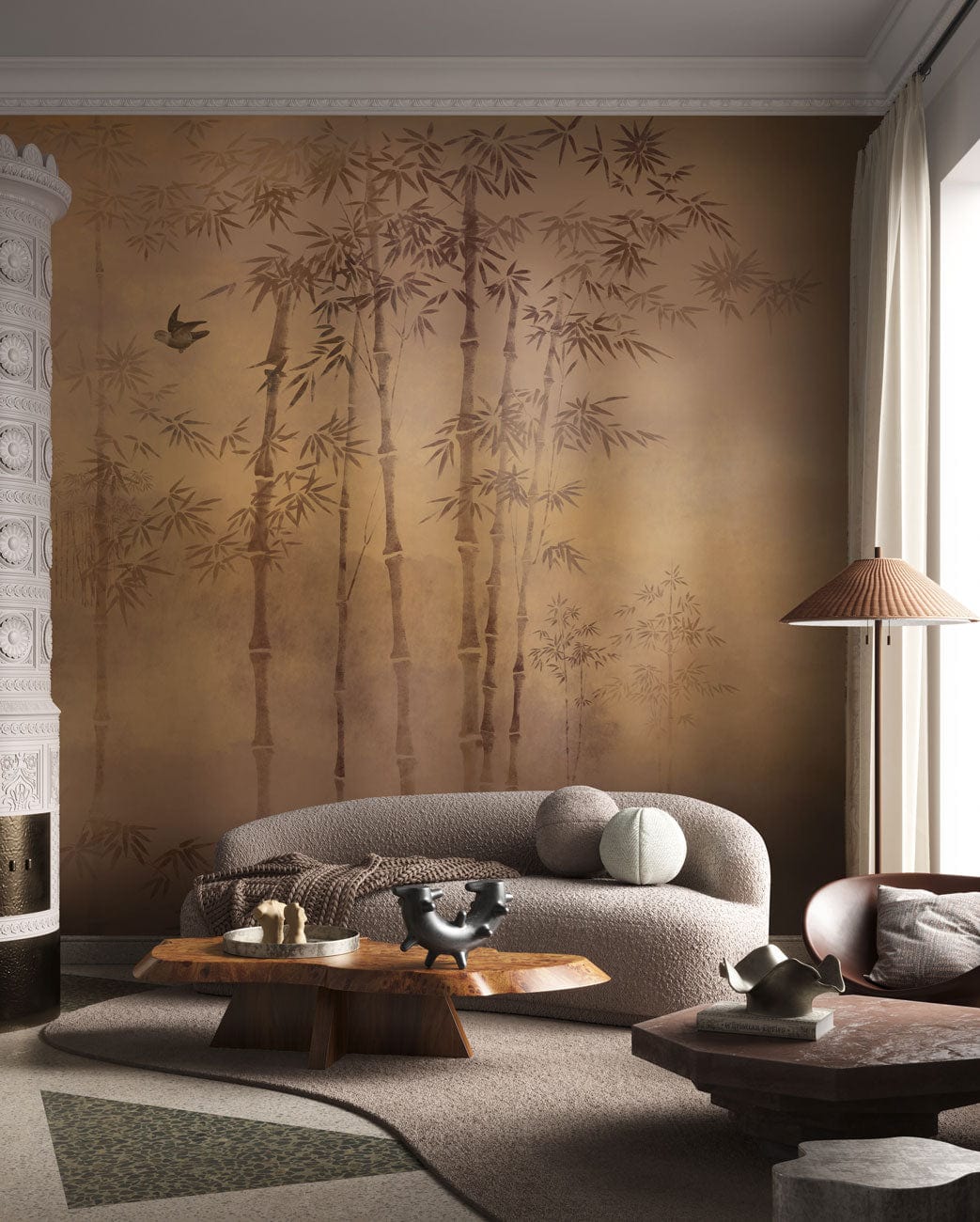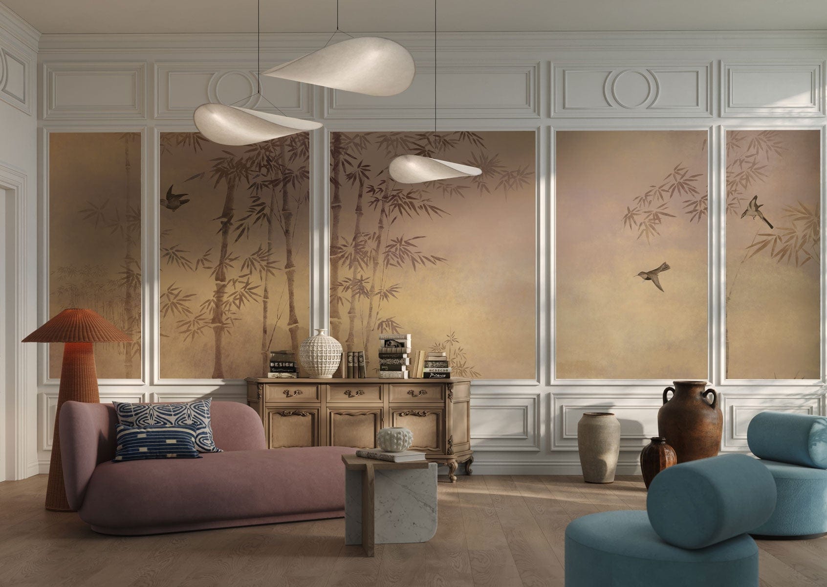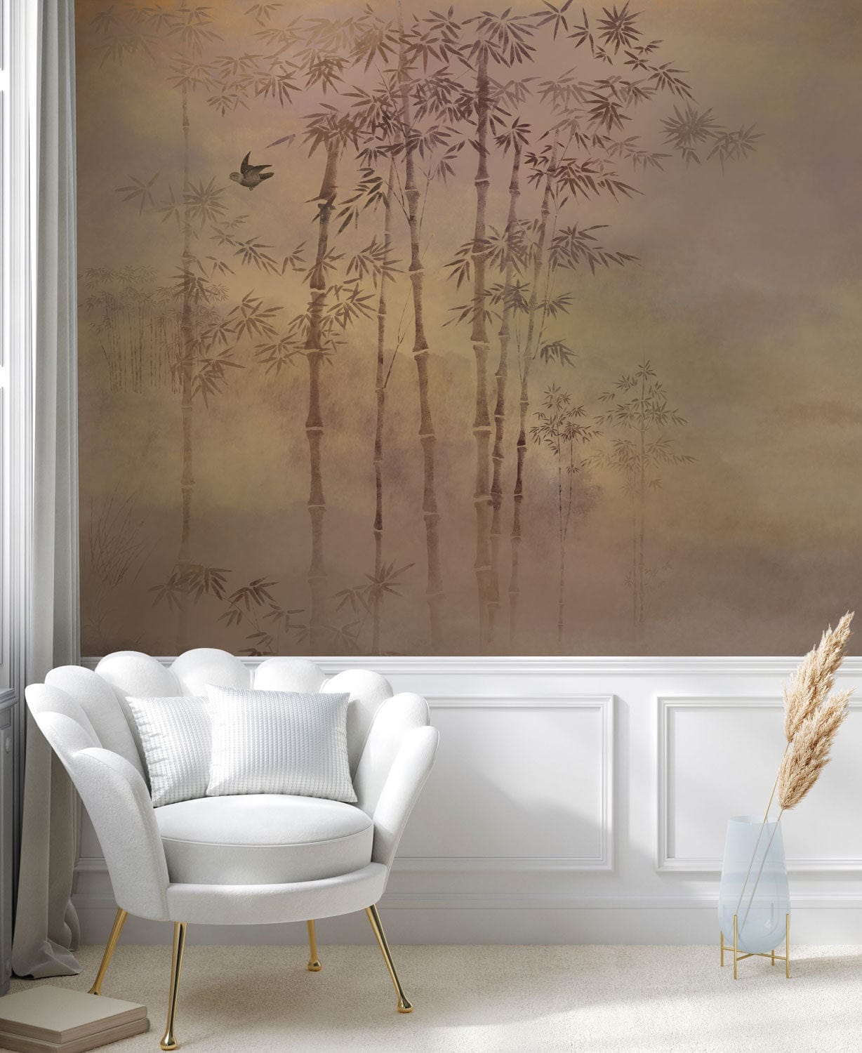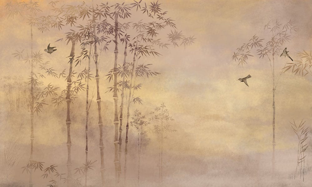 Immerse your space in the serene beauty of the Golden Bamboo Forest Mural Wallpaper. This exquisite design features delicate bamboo motifs gracefully depicted against a soft gradient background, evoking a tranquil atmosphere reminiscent of a misty dawn. The interplay of elegant lines and muted hues creates a sophisticated tapestry that blends seamlessly into any interior setting, offering a timeless appeal that enriches and captivates.