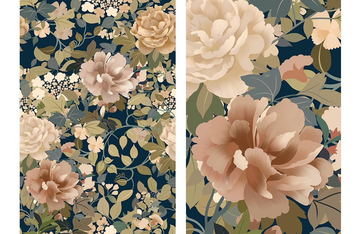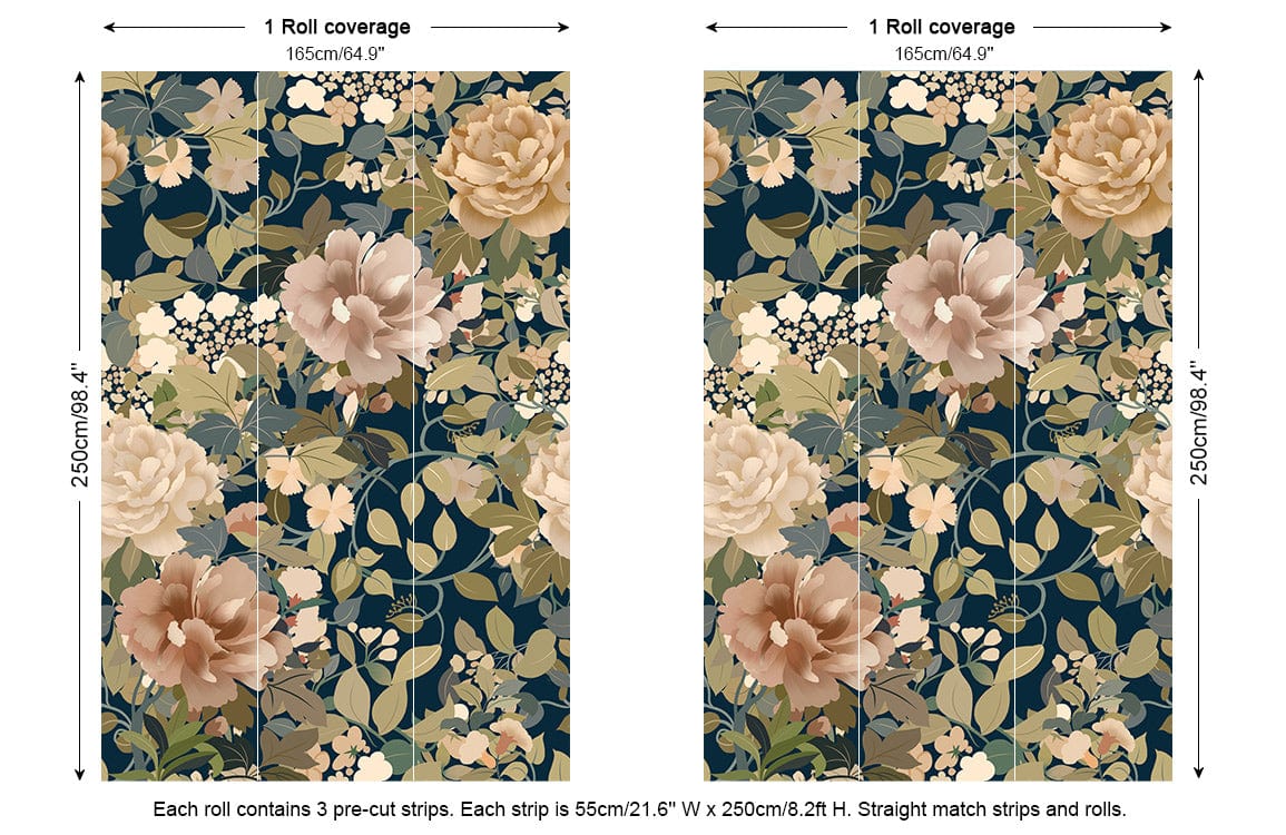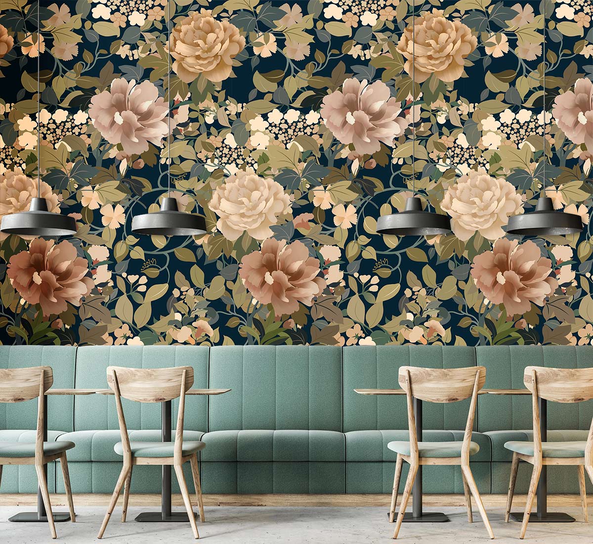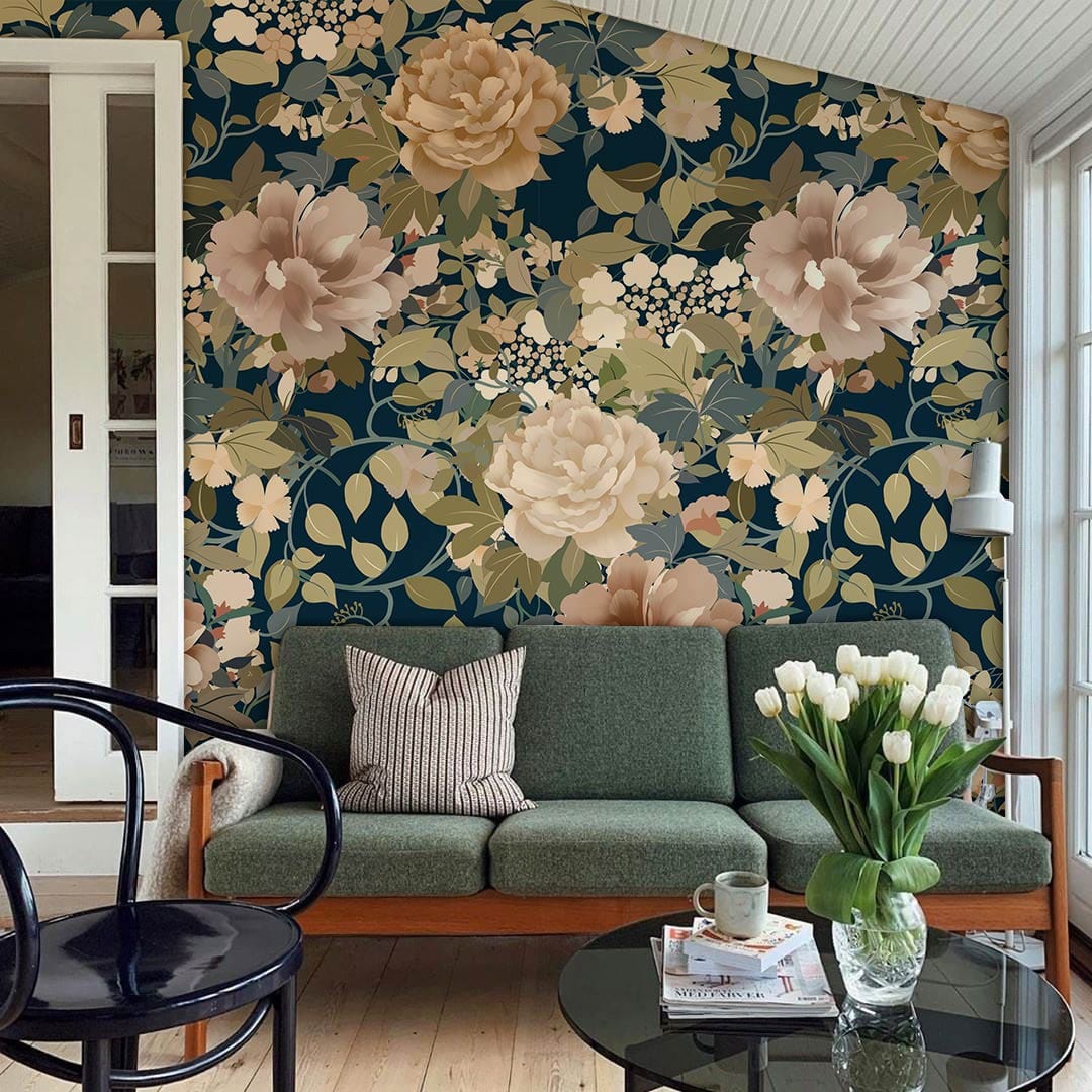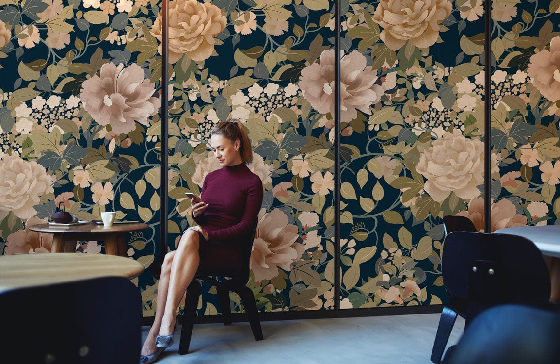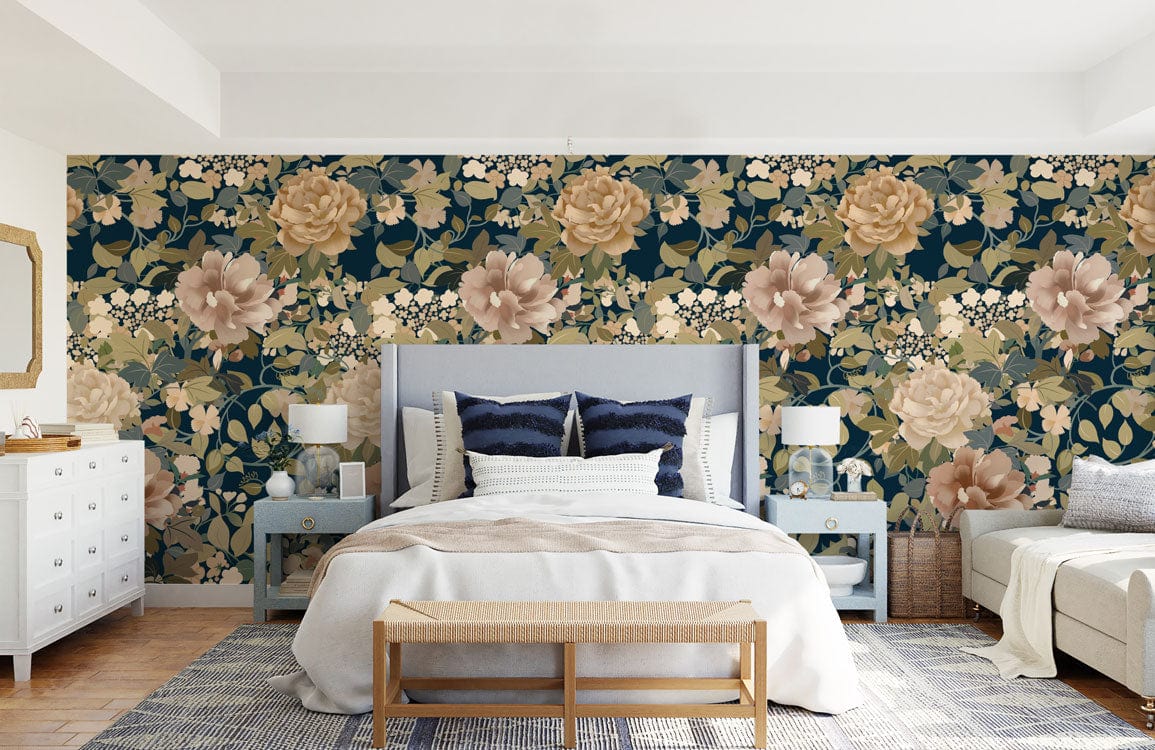 Golden Blossoms Wallpaper Mural envelops any room with its refined elegance. The design showcases luxuriant blooms against a deep indigo backdrop, creating a striking contrast that exudes sophistication. Rich, soft golds and delicate ivory hues dance across the mural, capturing the light with a graceful charm. Perfect for infusing your space with an artistic touch, this mural seamlessly fits traditional and contemporary settings, inviting an air of timeless beauty.