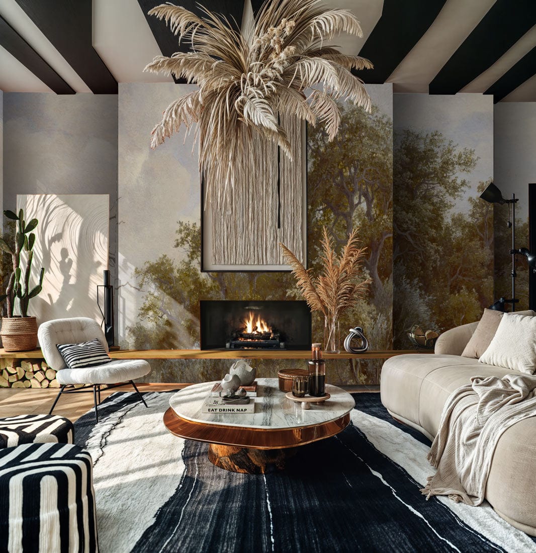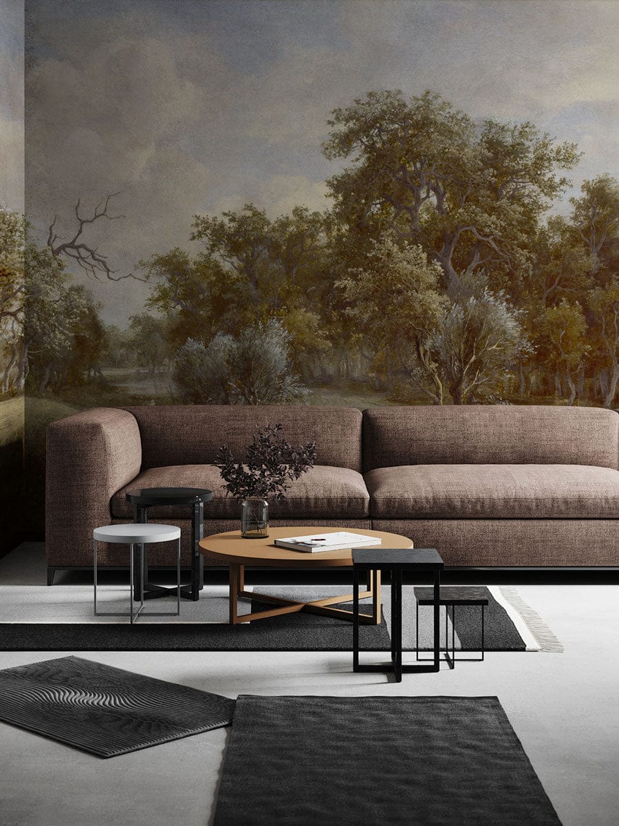 Golden Countryside Serenity Mural Wallpaper captures the tranquil beauty of a pastoral landscape, featuring lush trees and gentle skies. The detailed artistry reveals a harmonious balance of light and shadow, evoking a sense of peaceful elegance. This mural's sophisticated allure suits spaces seeking timeless sophistication.