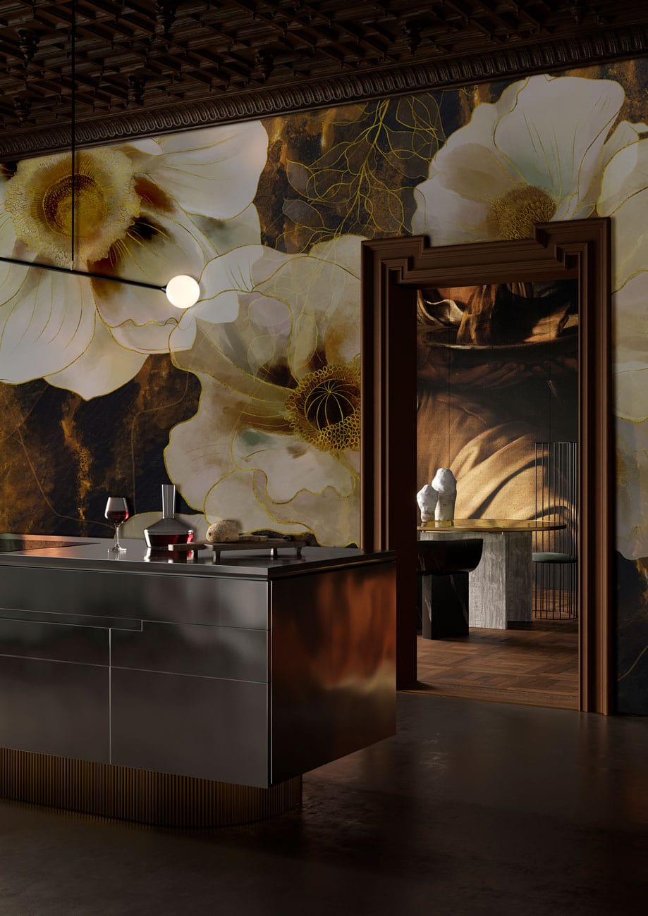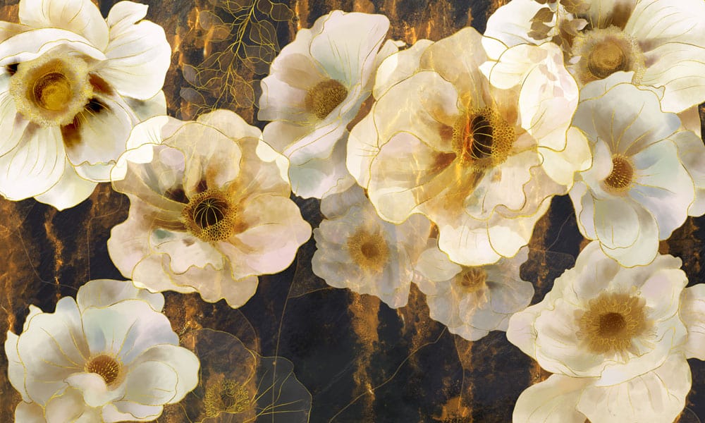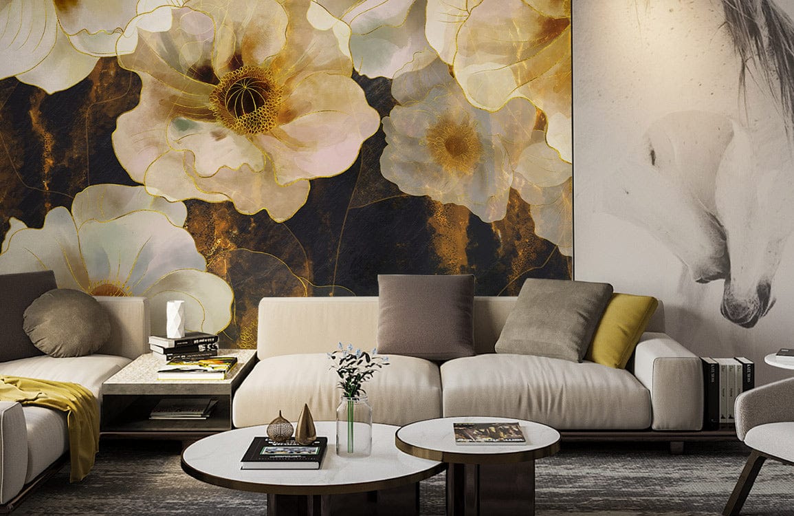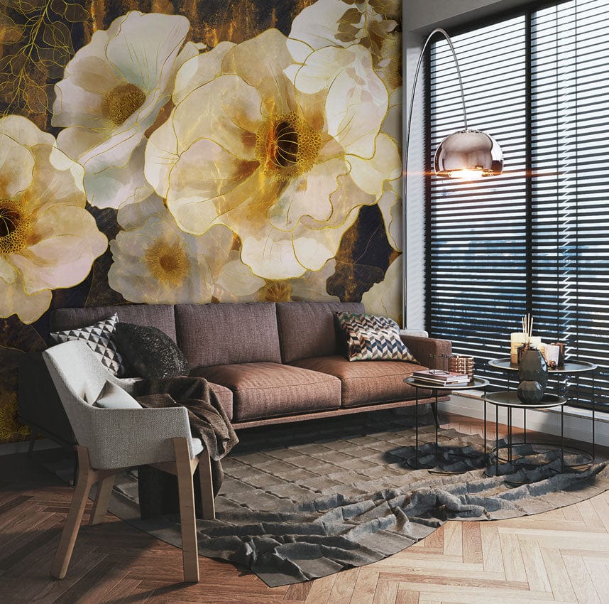 Immerse your living space in understated luxury with the Golden Edge Floral Wallpaper Mural. Exquisitely crafted, the delicate white blossoms unfurl against a rich, dark backdrop, intricately accented with shimmering golden veining. This mural effortlessly blends natural beauty with elegant artistry, making it an exquisite centrepiece for any room, from classic living spaces to contemporary settings.
