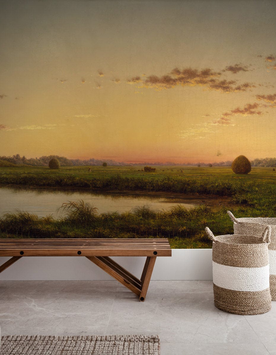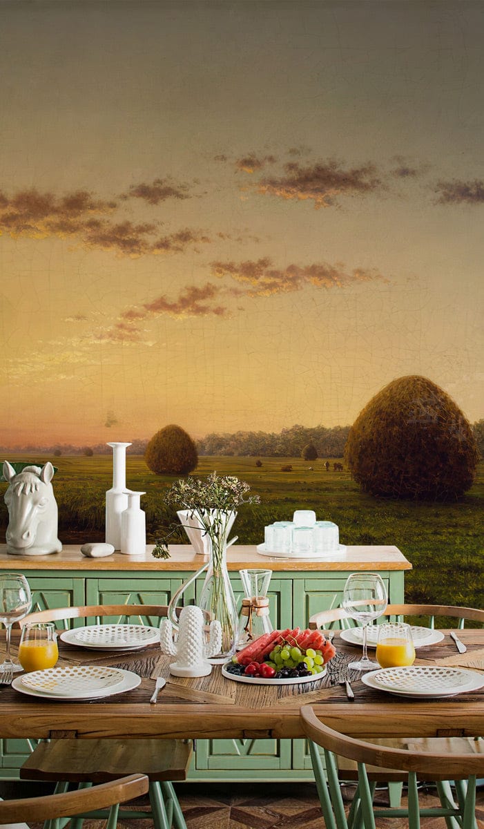Golden Horizon Serenity Mural Wallpaper captures the tranquil beauty of a sunlit landscape, where soft, amber skies meet sprawling verdant fields. This exquisite scenery adds a touch of serene sophistication, effortlessly blending with both contemporary and traditional spaces.