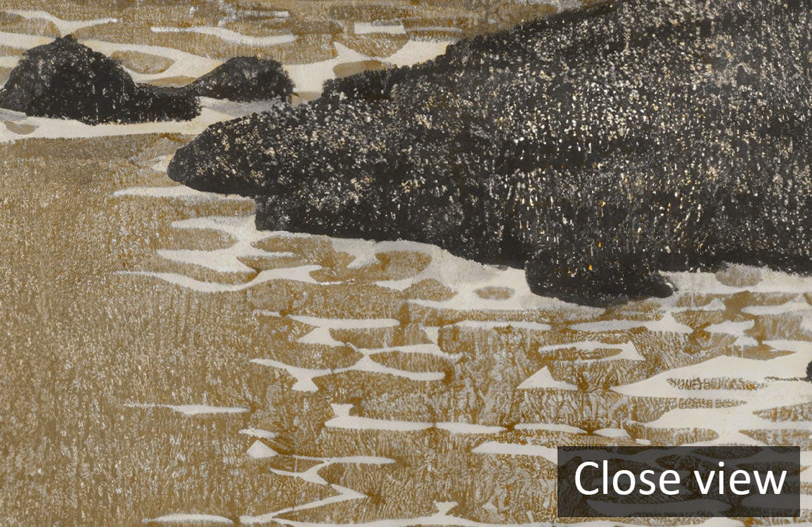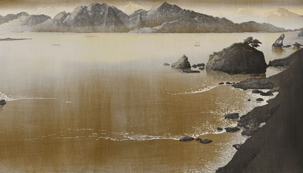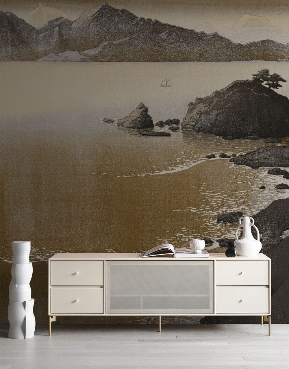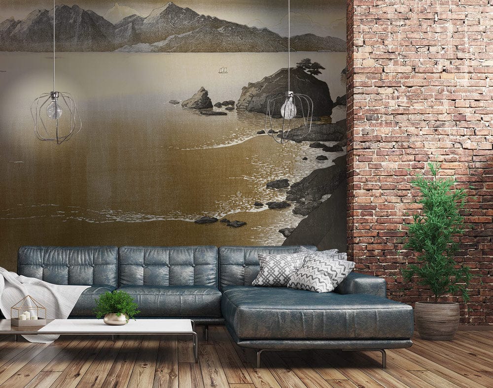The Golden Horizon Tranquility Mural Wallpaper captures the serene beauty of a mountainous coastal landscape at dusk. Its intricate depiction of gently lapping waves against timeless cliffs whispers elegance and stillness. Layers of subtle golden and earthy tones invoke a sense of calm sophistication, seamlessly integrating with both classic and contemporary interiors.