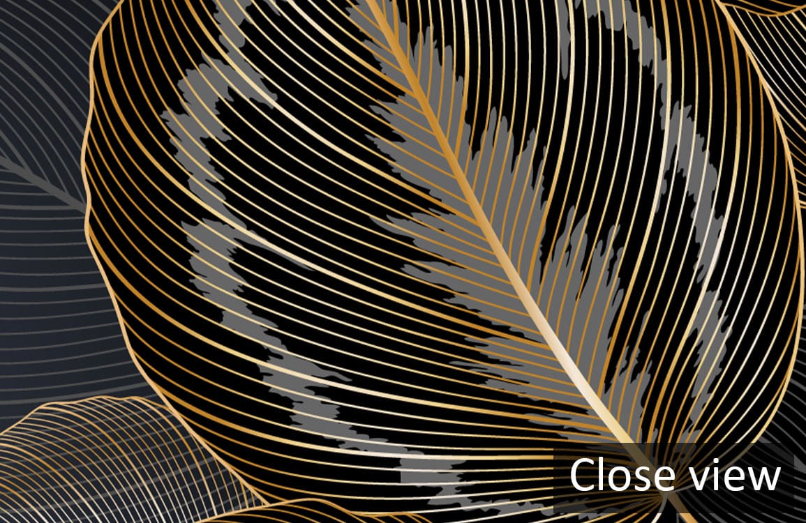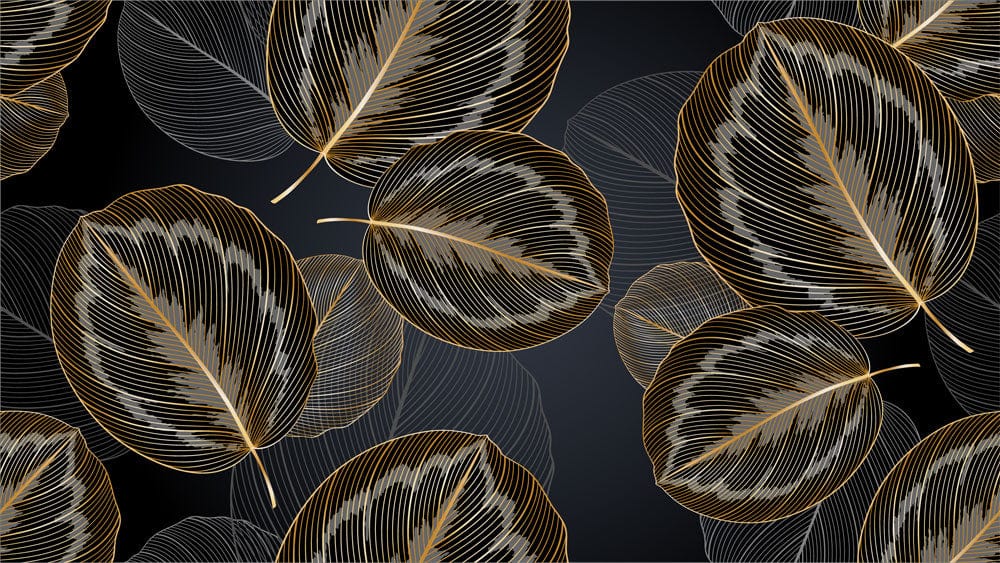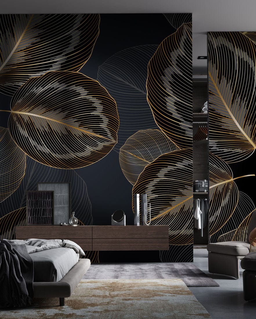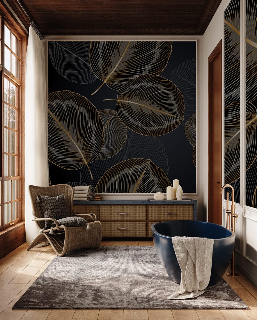 The Golden Leaf Elegance Mural Wallpaper exudes a sophisticated allure, capturing the graceful contours of nature with its intricately detailed leaf patterns. The interplay of shimmering gold outlines against a deep charcoal backdrop creates a captivating visual experience, inviting a sense of serenity and refinement into any space. Perfectly suited to a variety of interiors, this wallpaper effortlessly complements both classic and contemporary aesthetics, offering timeless elegance and a touch of artistic flair.