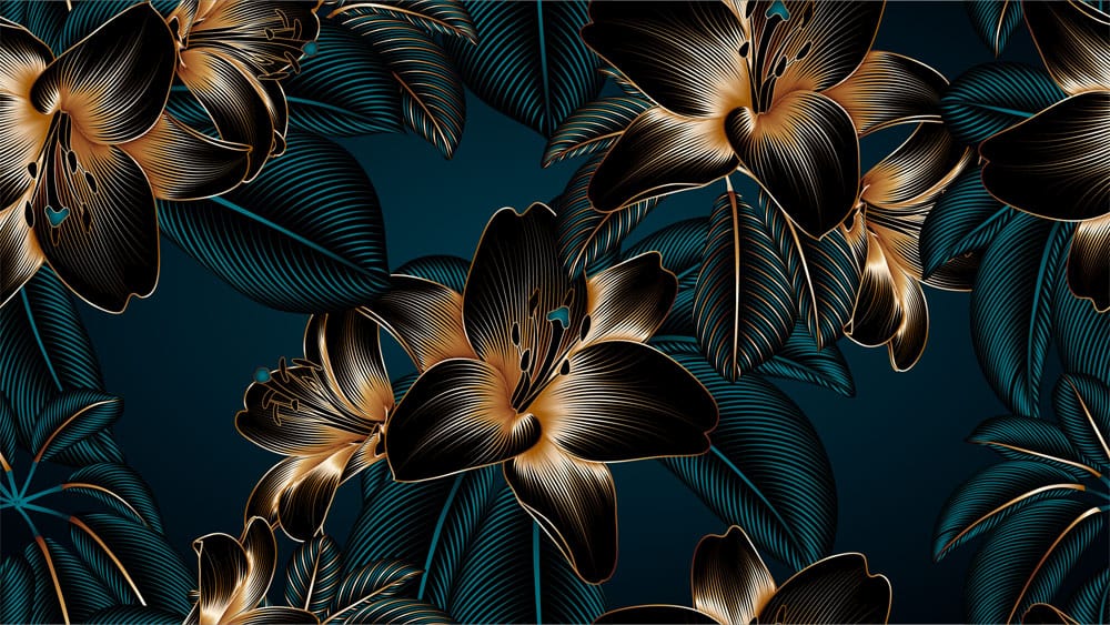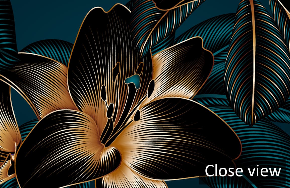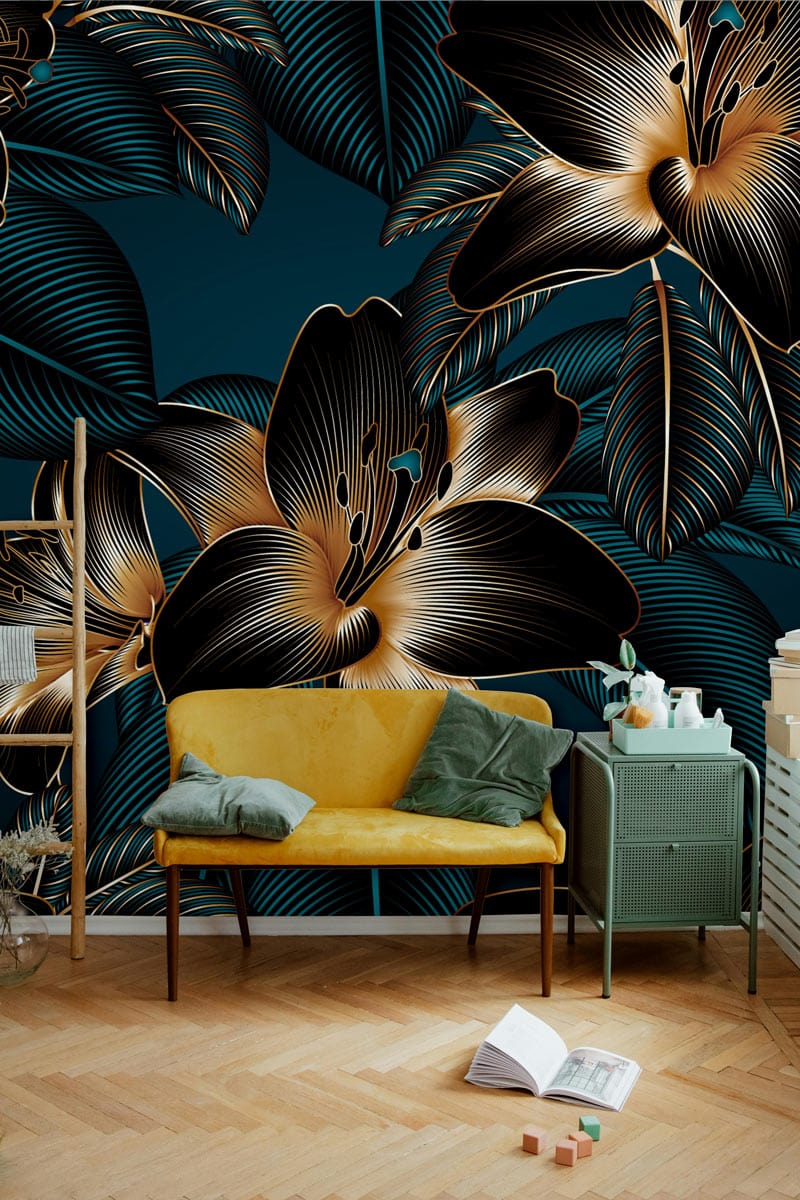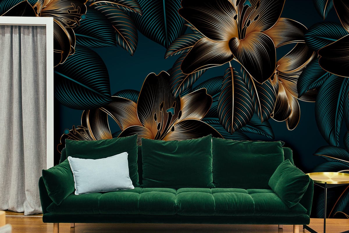 Embrace the lavish sophistication of the Golden Lily Elegance Mural Wallpaper. With its intricate floral motifs in shimmering gold against a lush teal background, this wallpaper brings a rare fusion of artistry and refinement to any setting. Each petal and leaf is meticulously detailed, creating a tapestry of natural beauty that lends a timeless appeal to your interiors. Ideally suited for spaces requiring a touch of luxury and warmth, this mural seamlessly complements both classic and contemporary styles.