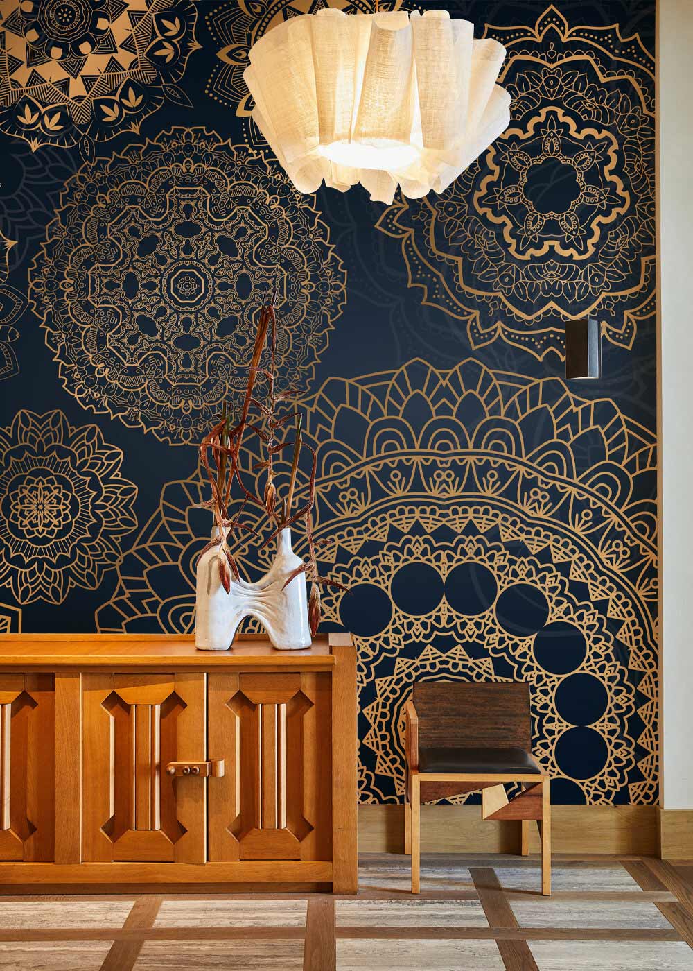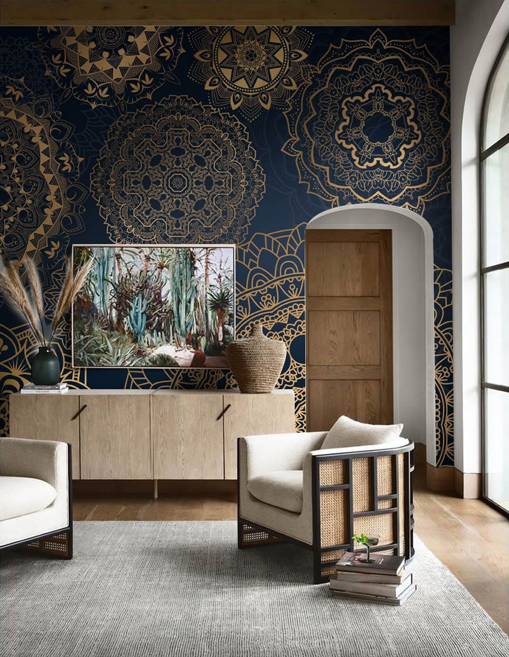 The Golden Mandala Patterns Wallpaper Mural captures the essence of luxury and artistry with its intricate mandalas layered in lustrous gold set against a deep blue backdrop. This exquisite mural is a celebration of timeless design, perfect for adding a touch of opulence and depth to any room. Each mandala is meticulously detailed, creating a textured appearance that draws the eye and invites contemplation. Ideal for both contemporary and classic interiors, this wallpaper establishes an ambience of serene sophistication.