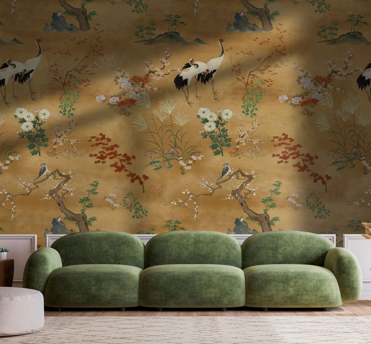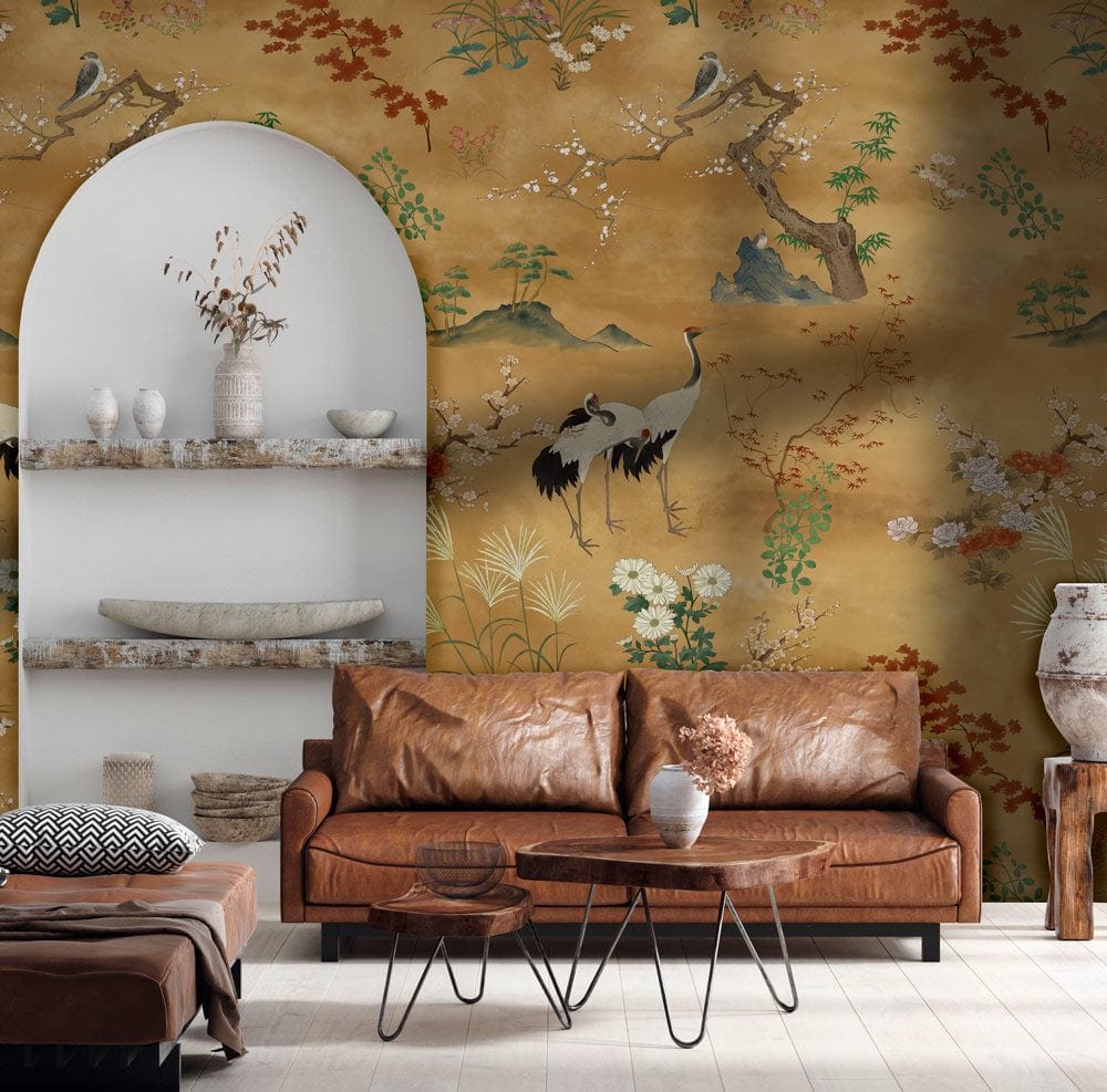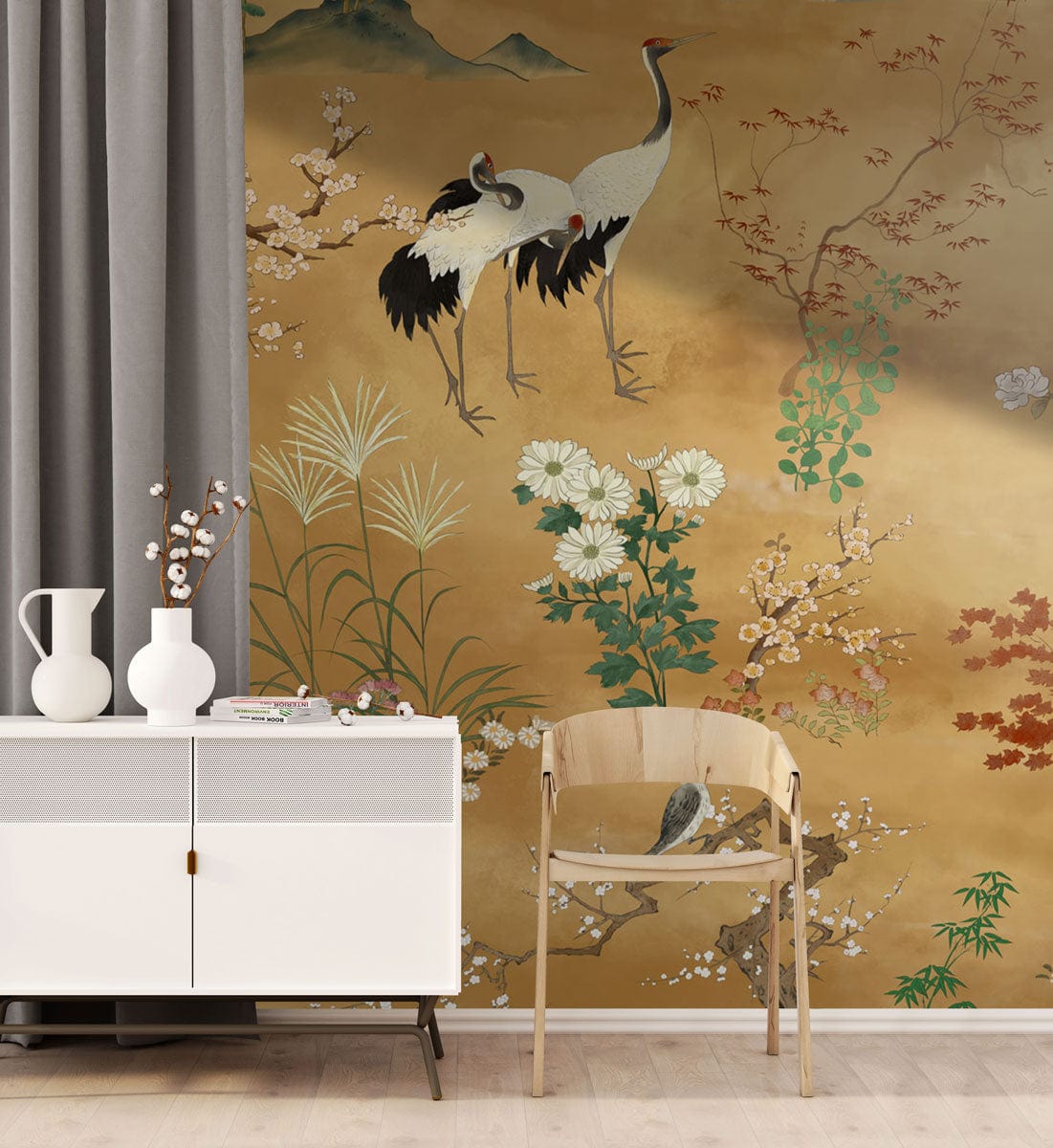 Immerse your space in the serene beauty of the Golden Meadow Cranes Mural Wallpaper. This exquisite design features elegant cranes amidst a tapestry of delicate flora, set against a warm honeyed backdrop. The subtle artistry in its brushstrokes creates a sense of depth and movement, making it an ideal centrepiece for interiors that seek a touch of nature's tranquillity and sophistication.