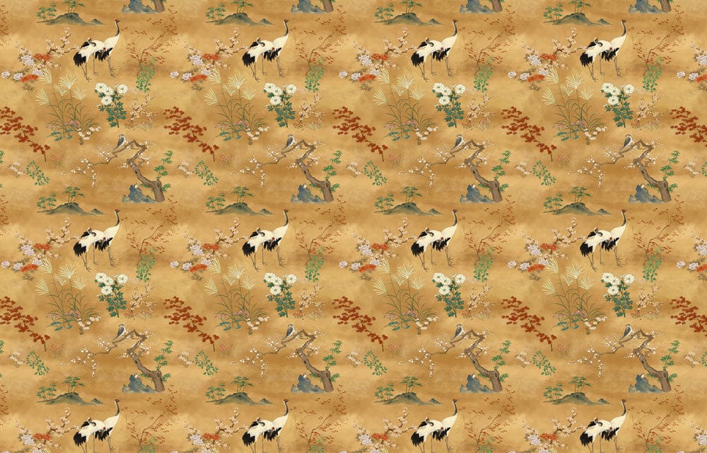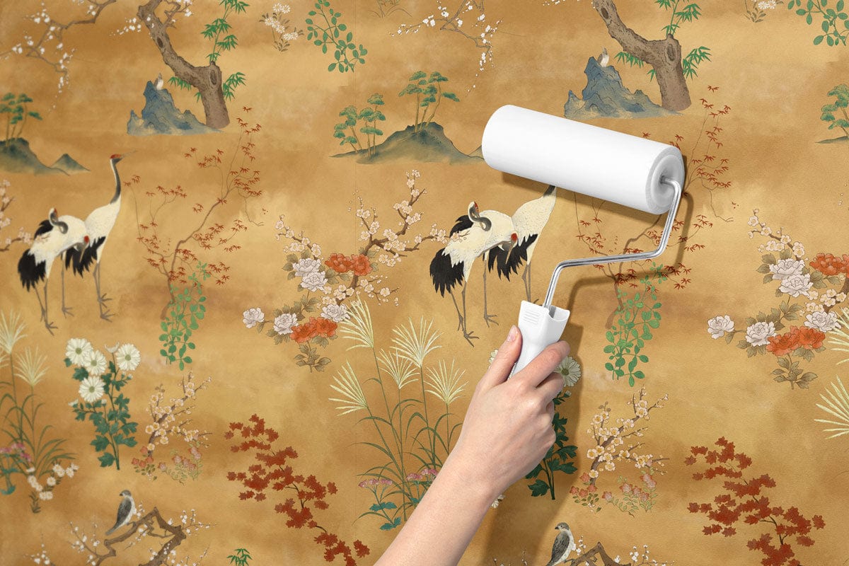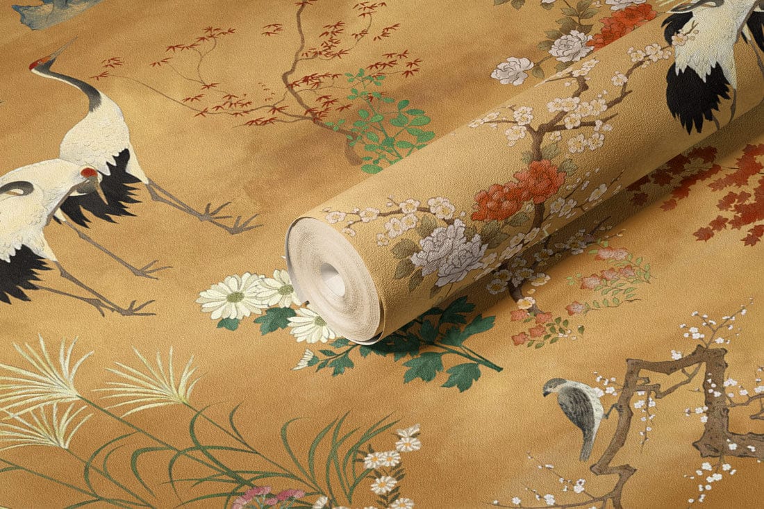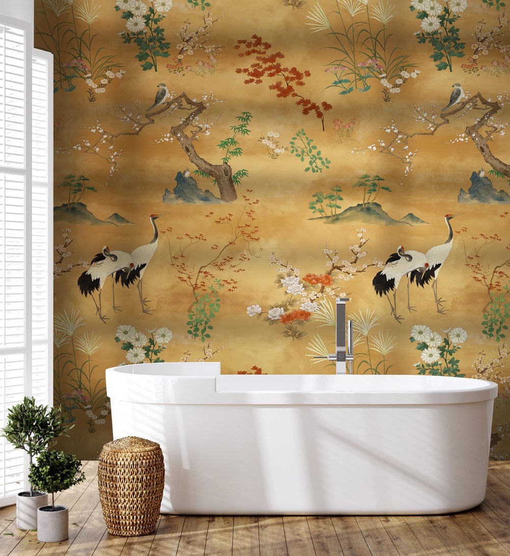 Immerse your space in the serene beauty of the Golden Meadow Cranes Mural Wallpaper. This exquisite design features elegant cranes amidst a tapestry of delicate flora, set against a warm honeyed backdrop. The subtle artistry in its brushstrokes creates a sense of depth and movement, making it an ideal centrepiece for interiors that seek a touch of nature's tranquillity and sophistication.