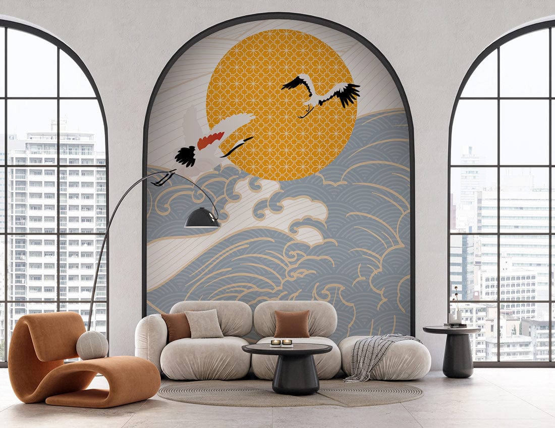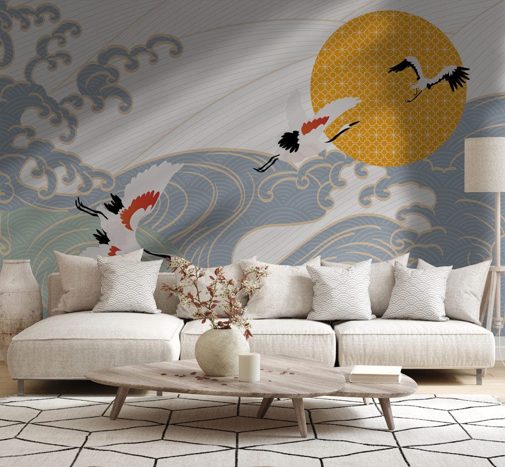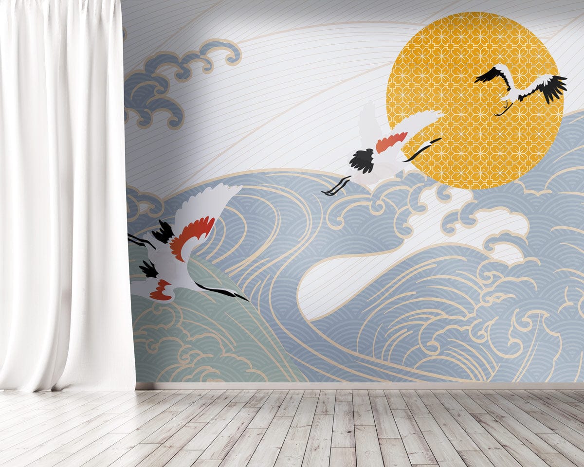 Immerse your space in a serene tapestry of nature's elegance with the Golden Sun and Waves mural wallpaper. This exquisite design features graceful cranes soaring amidst swirling ocean waves under a resplendent golden sun, offering a harmonious blend of movement and tranquillity. The intricate details and soothing palette create a timeless atmosphere, making this an ideal choice for spaces that desire a touch of sophistication and artistic flair.