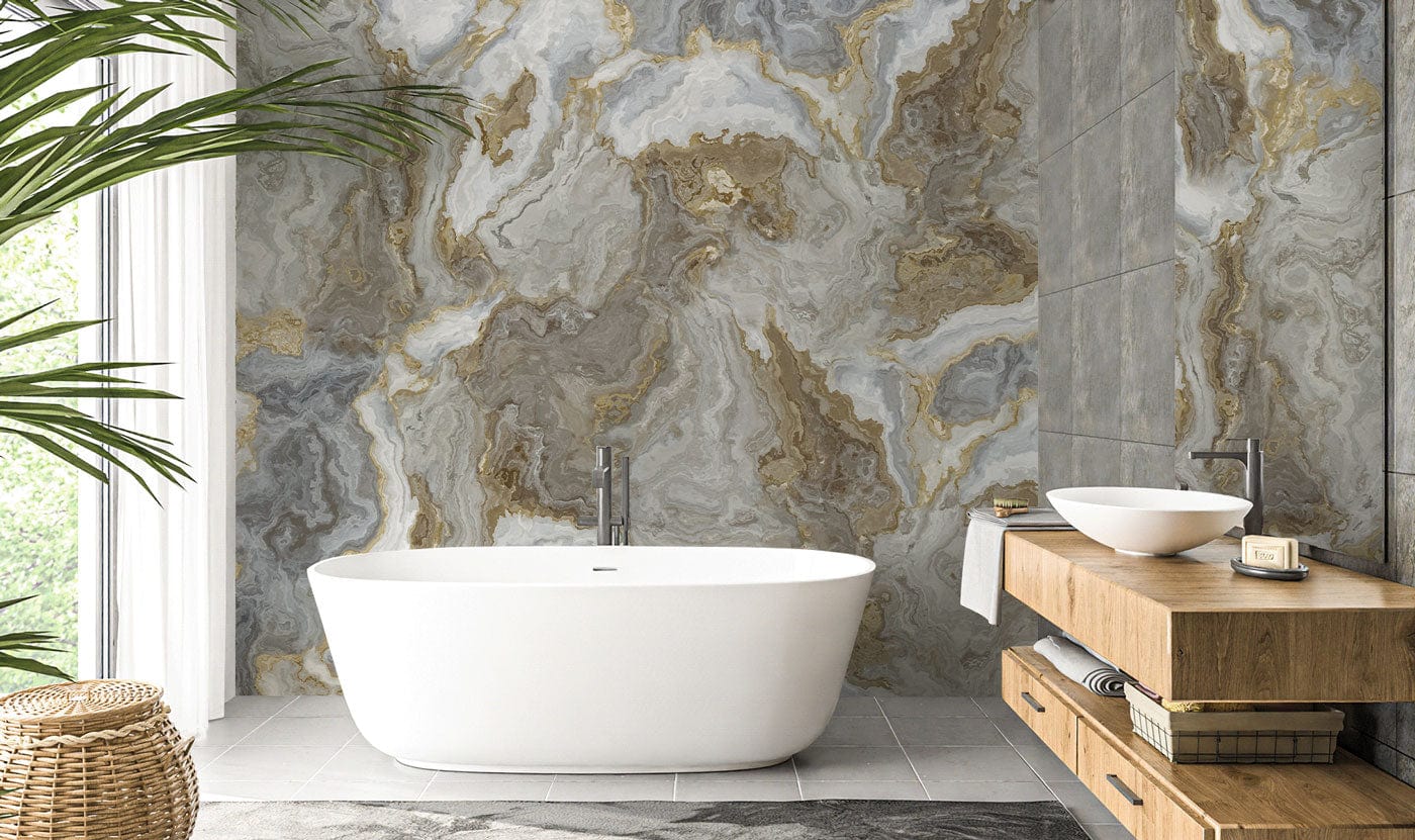 The Golden Tide Marble Mural Wallpaper captures the elegance of nature with its flowing marble patterns. Grey, gold, and ivory hues intertwine, creating a visual masterpiece that evokes luxury and sophistication. Perfect for modern spaces, its textured design draws the eye and invites a sense of depth and natural beauty. This timeless piece complements various interiors, bringing a touch of artistic flair to any room.