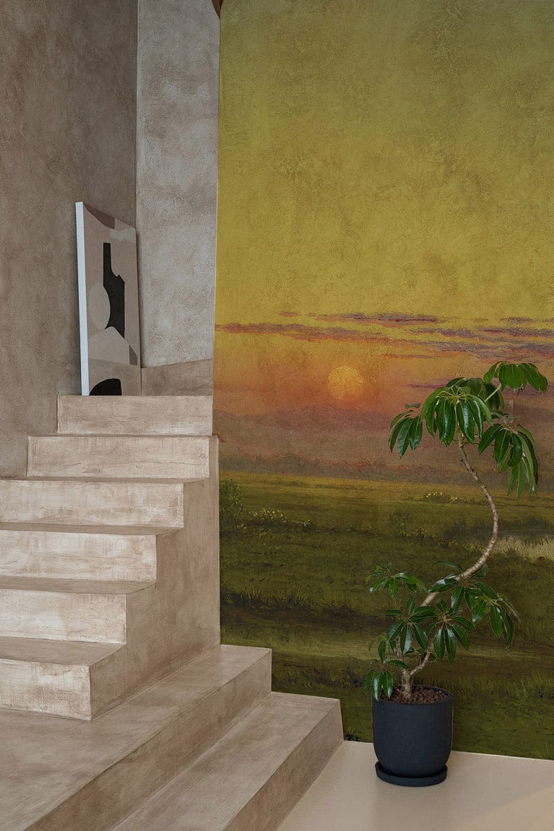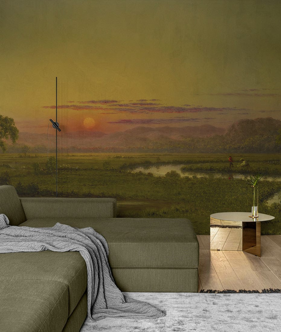 Golden Valley Serenity Mural Wallpaper artfully captures the tranquil beauty of a lush, verdant landscape at sunset. The scene's delicate interplay of light and shadow offers a timeless elegance that seamlessly complements both modern and classic interiors. With its exquisite detailing, this mural brings an atmosphere of calm and sophistication into any space it adorns.