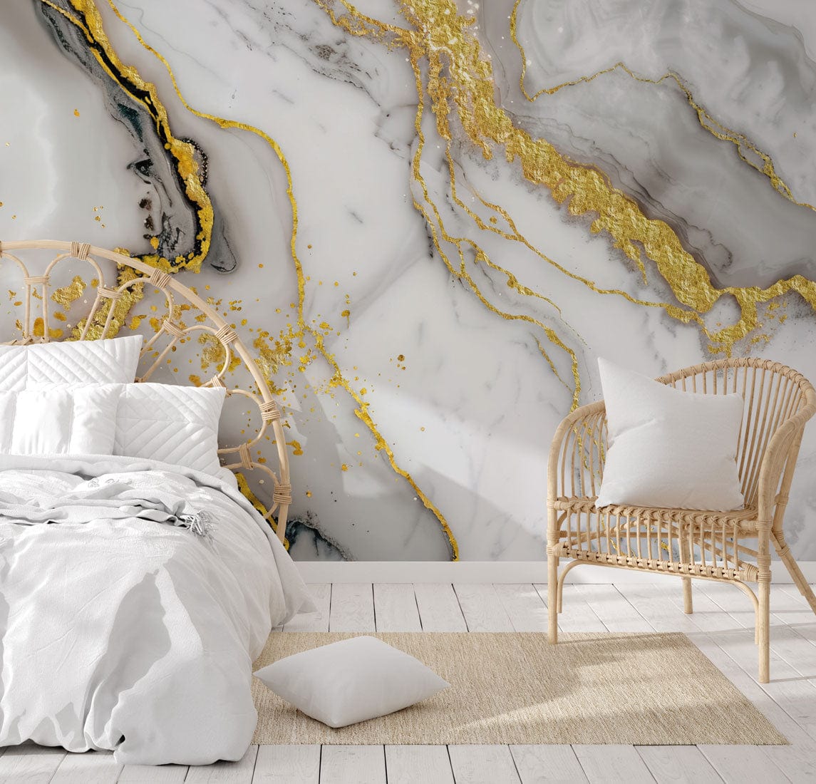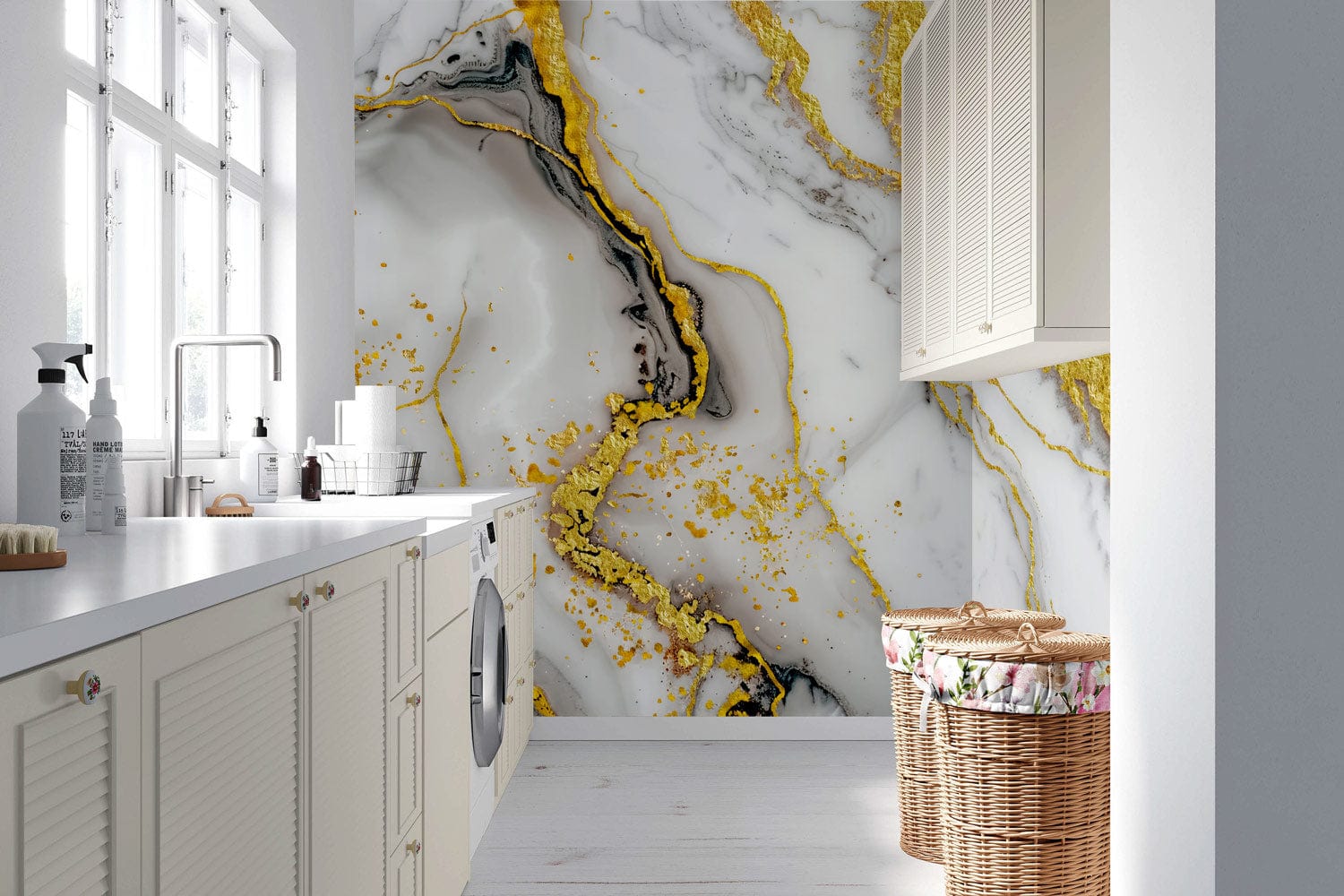 Introducing the Golden Veined Marble Mural Wallpaper, a sophisticated interplay of fluid marble textures laced with shimmering golden veins. The elegantly swirling patterns invite a sense of dynamic movement, making it a timeless addition to any interior space. This mural brings an artistic touch, combining classic luxury with contemporary flair, ideal for those seeking a distinguished yet versatile aesthetic.