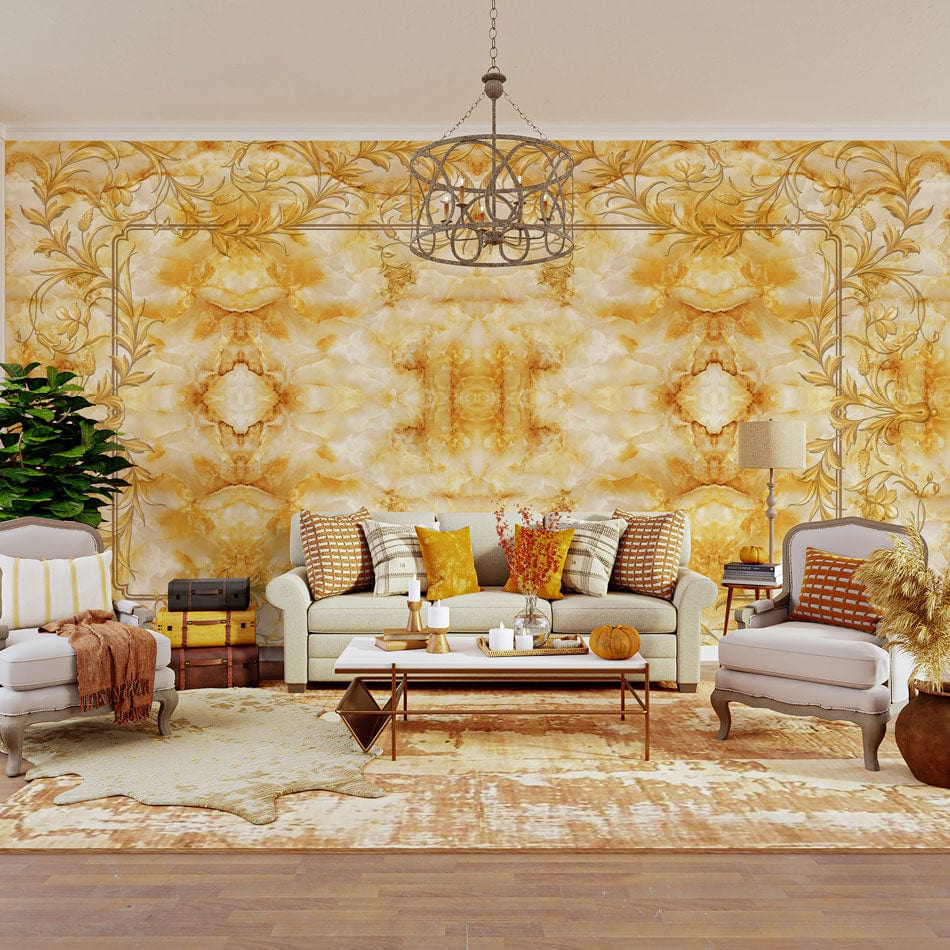 The Golden Vines Crystal Wallpaper Mural encapsulates a lush tapestry of intricate vine patterns entwined with crystalline textures. Its luxurious golden hues and delicate detailing create a regal atmosphere, effortlessly gracing any space with timeless elegance. This artistic masterpiece brings a sophisticated air to interiors, seamlessly fitting into both classic and contemporary settings.