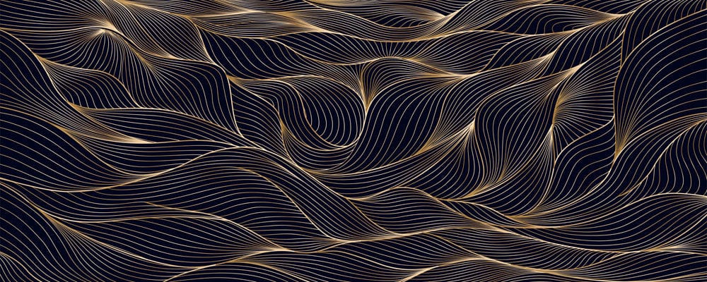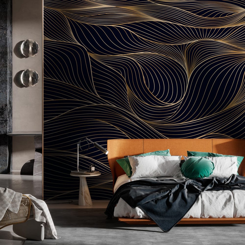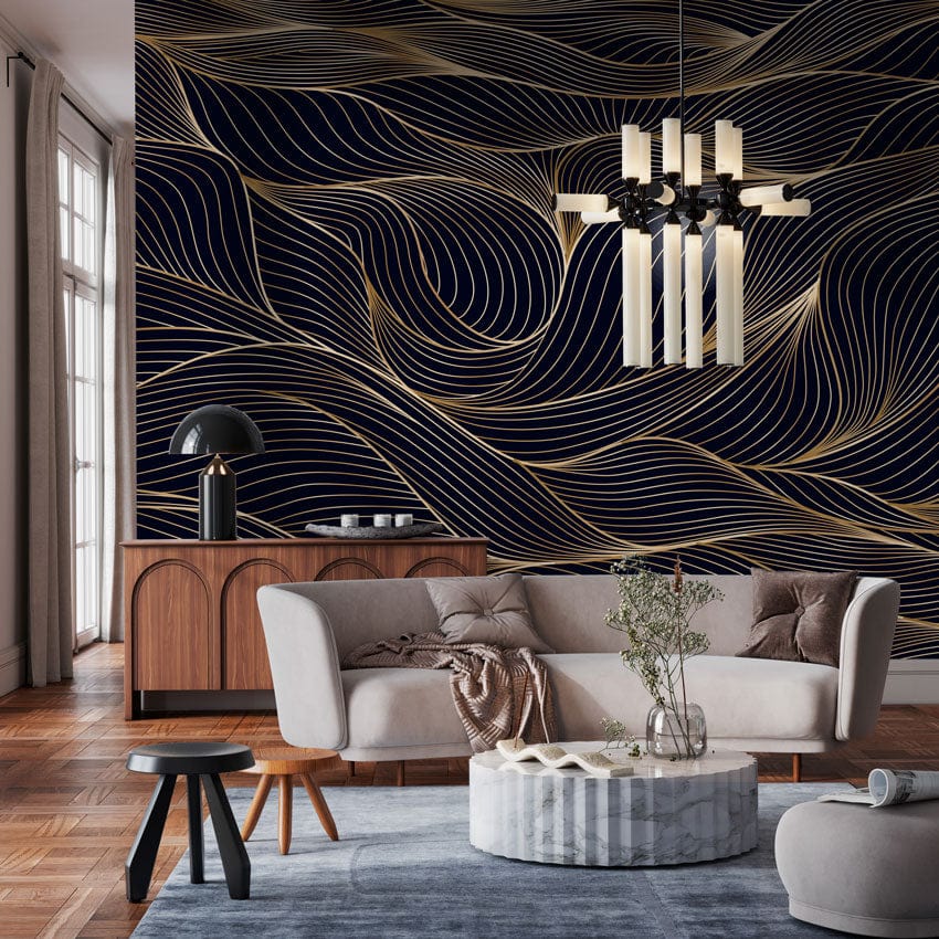 Immerse your space in luxury with the Golden Wave Lines Mural Wallpaper, where elegant golden lines ripple across a deep charcoal backdrop, creating a stunning visual rhythm. Each wave is meticulously crafted, offering a refined texture that dances with light, reminiscent of rippling waters under a serene moonlit sky. This sophisticated design complements a range of interiors, adding a touch of timeless grace and sophistication.
